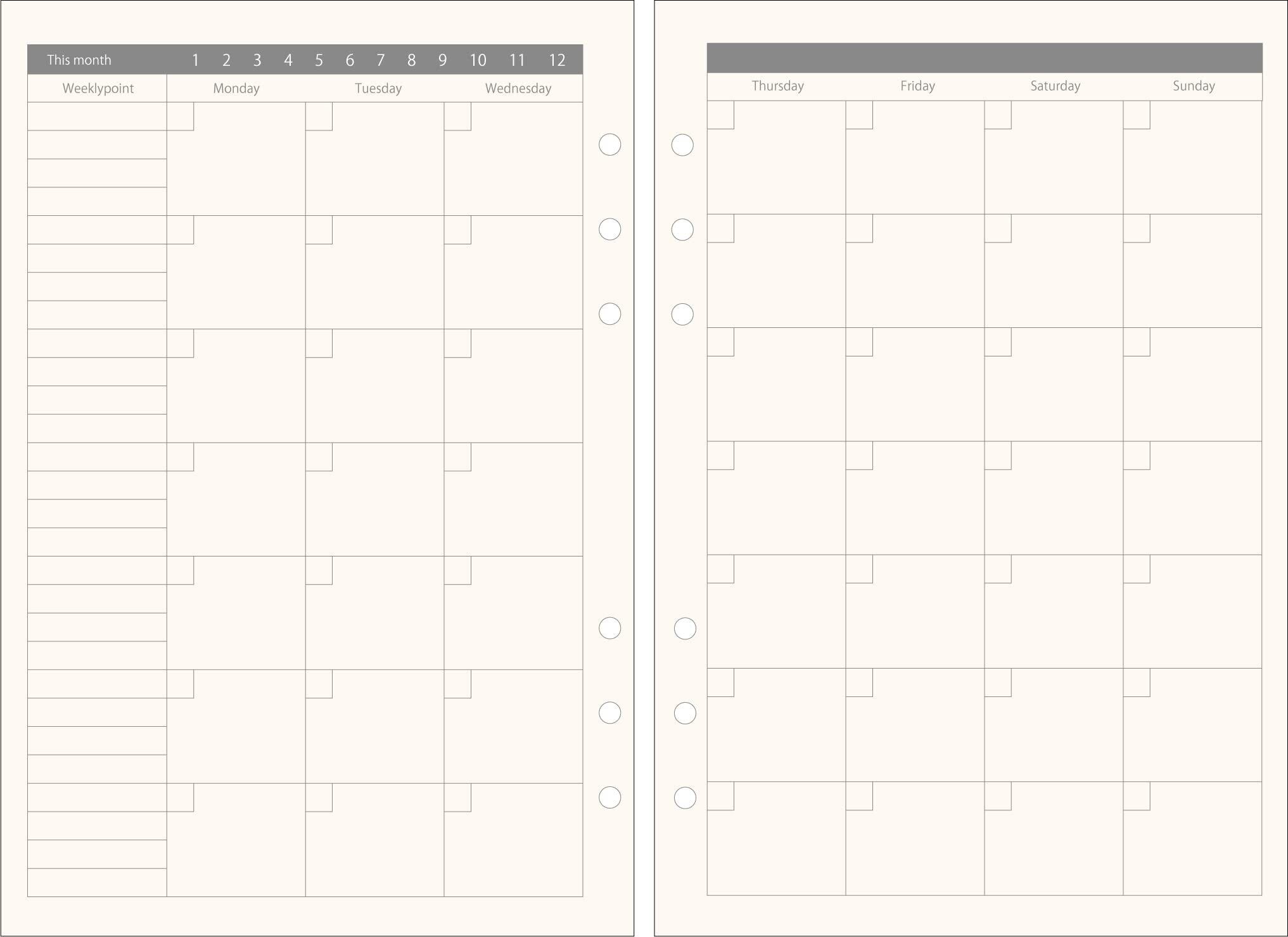 はじめたいタイミングで開始できる日付無し月曜始まりタイプのA5サイズの月間スケジュール