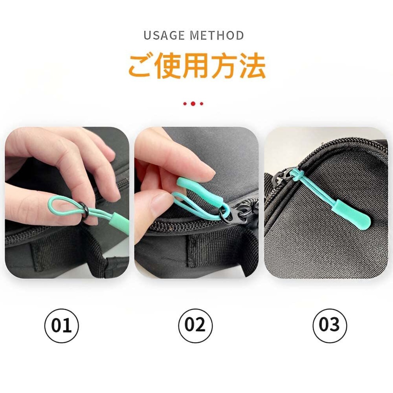 【簡単に取り付】工具は不要、手での取り付けが可能,ジッパー端のリングに結ぶだけ。