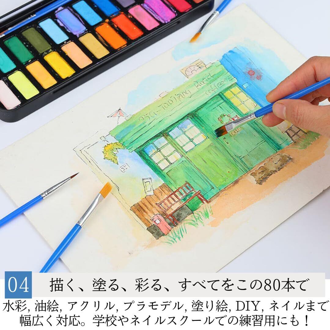 【80本使い分けで、効率UP】大容量80本セットで、色ごとに筆を使い分け、筆洗いの手間を削減。水彩、油絵、アクリル画、プラモデル塗装…様々な用途に対応。色が混じる心配もなく、スムーズに作業を進められます。時間を有効活用して、作品のクオリティをさらに高めましょう。家族や友人と分け合って、一緒に創作を楽しみませんか。
