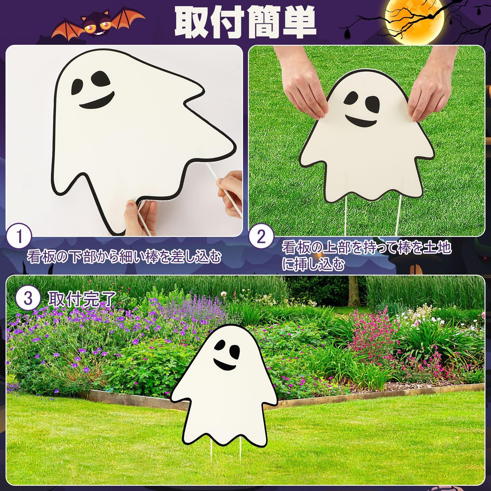 活躍場合:ハロウィン 屋外 飾りに最適です。庭や芝生だけでなく、自宅やお店の大きい盆栽に挿入して装飾できます。簡単な取付方法と雰囲気満々な外観で、ハロウィンイベントやハロウィンパーティーの目印、店舗のディスプレイにも適用します
