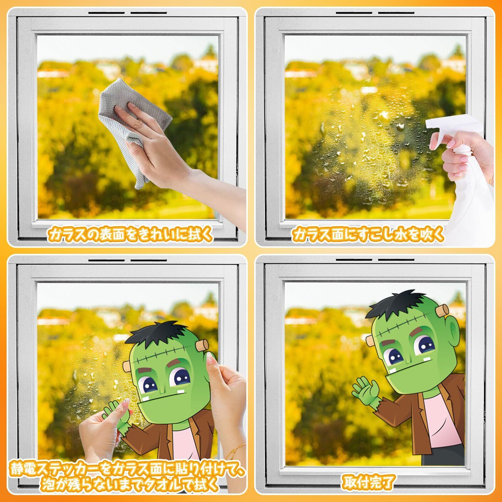 【適用場合】ハロウィン 静電ステッカーは窓、金属製のドア、鏡、冷蔵庫、タイルなどの滑らかな表面に適用します。自宅のインテリアだけでなく、自動車のウィンドウステッカー、店舗ディスプレイのハロウィーン 装飾、ハロウィンイベントのデコレーションなど、色々なシーンで活用できます。