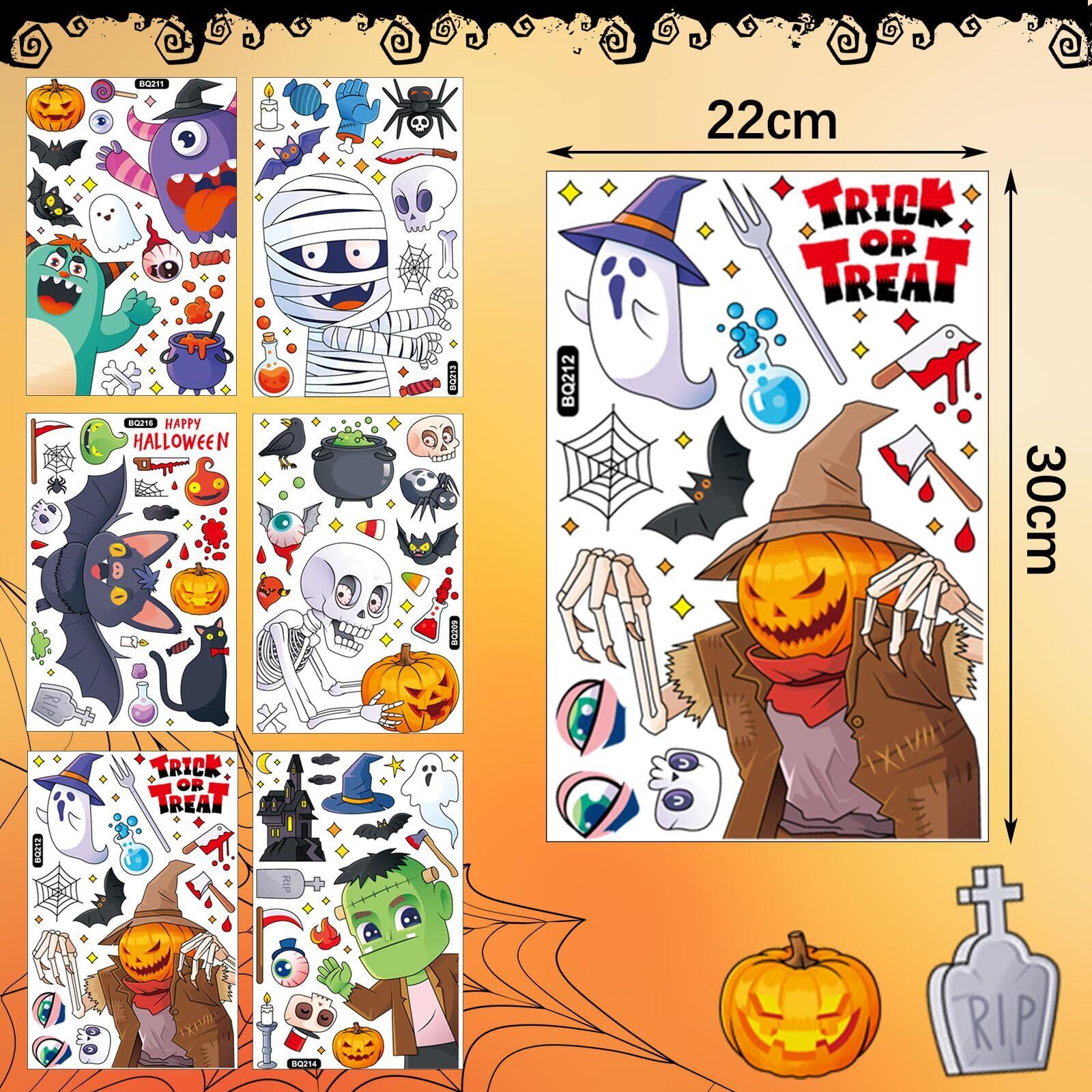 【 ハロウィン ステッカー のデザイン】カボチャ、コウモリ、モンスター、妖怪、幽霊、骸骨など、様々なハロウィンアイテムを利用して、かわいい絵柄にデザインされました。漫画のスタイルと鮮やかなカラーで、ハロウィンの雰囲気が溢れるとともに、不気味な気持ちがしません。子供がいる場合に活躍しているハロウィン 飾りです。