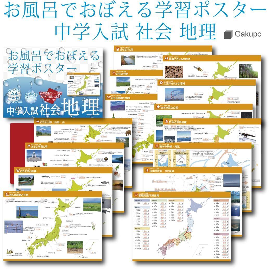 Gakupo お風呂でおぼえる学習ポスター 中学入試 社会地理(暗記シート付) 防水 都道府県名 中学受験 白地図 社会地理