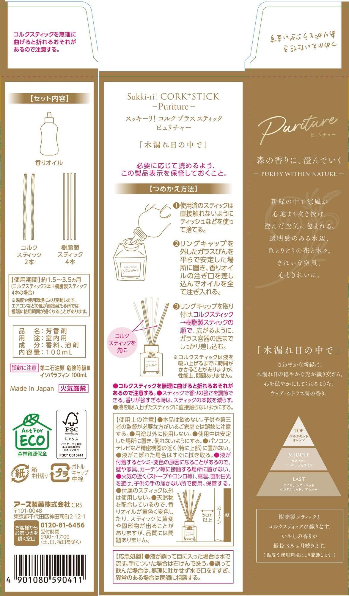 スッキーリ!Sukki-ri! コルク+スティック ピュリチャー 「木漏れ日の中で」 リードディフューザー ウッディシトラス調の香り 詰替 100ml