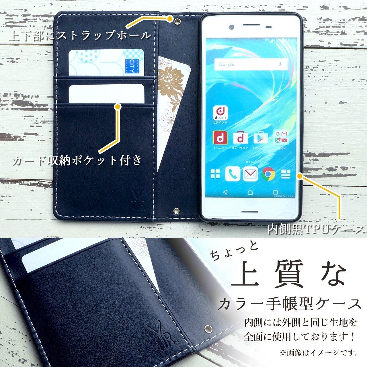 スタンド式、ワイヤレス充電には対応しておりません。手帳部分とケース部分は接着しておりますが、強くめくると剥がれる場合がございます。