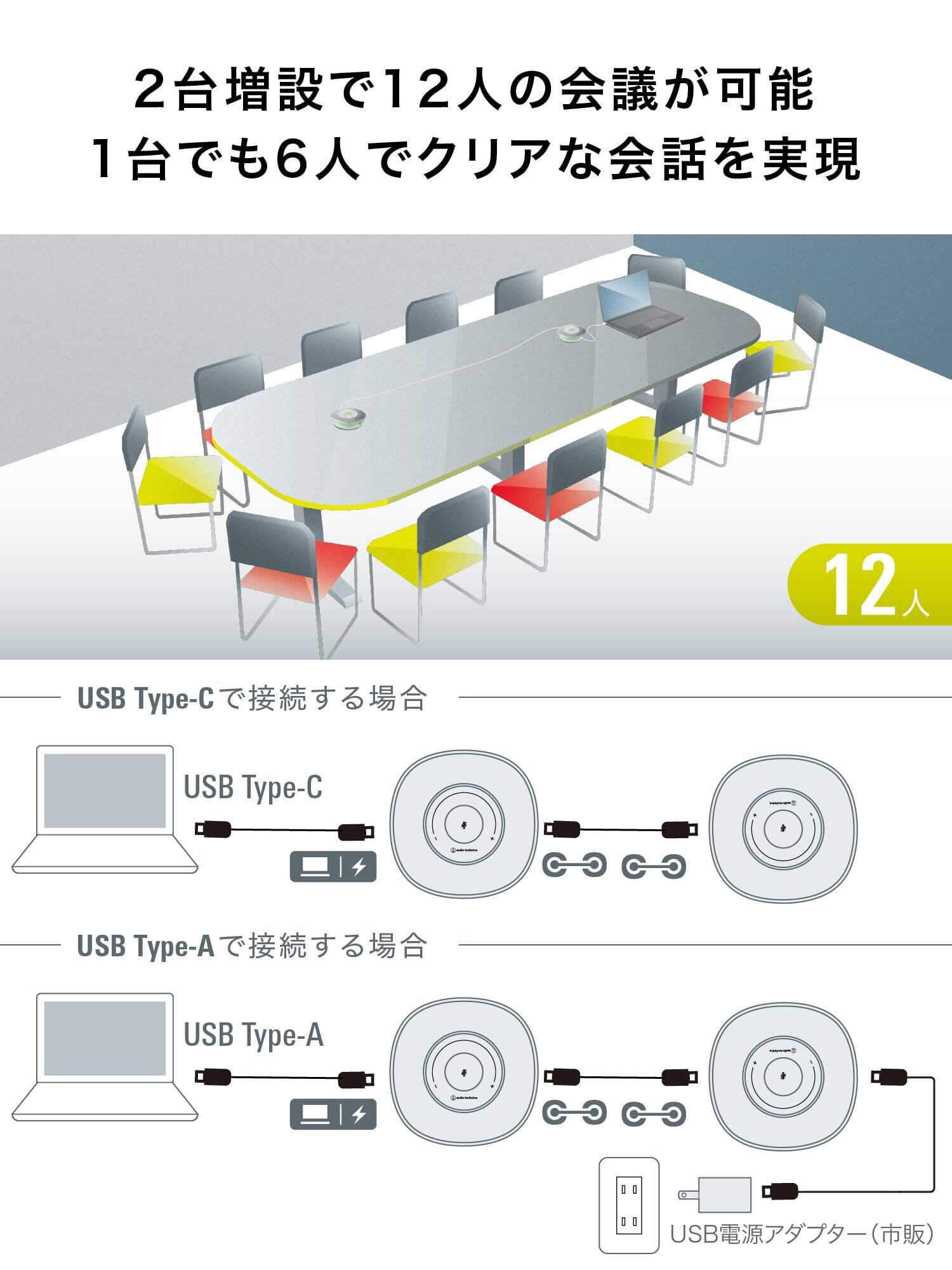 2 台連結接続により、最大12 人での会議に対応:推奨距離は半径1m 以内(最⼤2m以内)、推奨最⼤⼈数は6名での使⽤が可能。また、本製品を2台連結することで、最⼤12⼈まで同時に使えます。⼤きな会議室でも声を張らずに話せるだけでなく、どの席でも聞こえやすい特徴を持ちます。