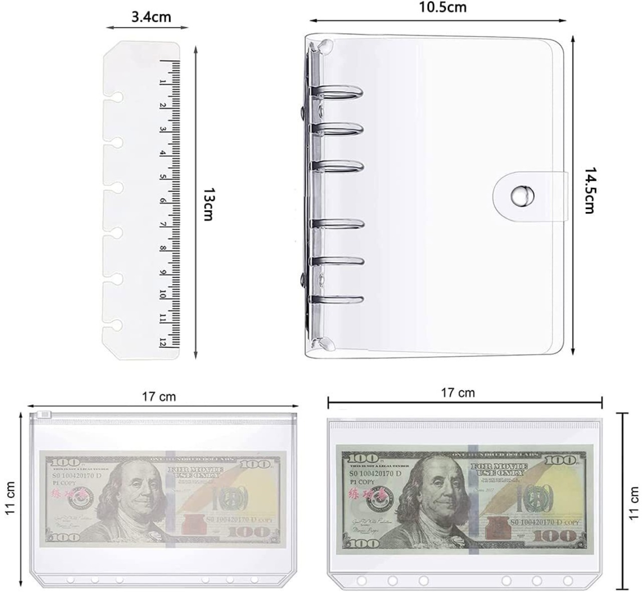 YFFSFDC システム手帳 A7 PVC バインダー ミニ6穴手帳 ポケットサイズ PVCクリア素材 柔らかい ボダン付き A7クリアポケット 3枚付き 定規付き ノート