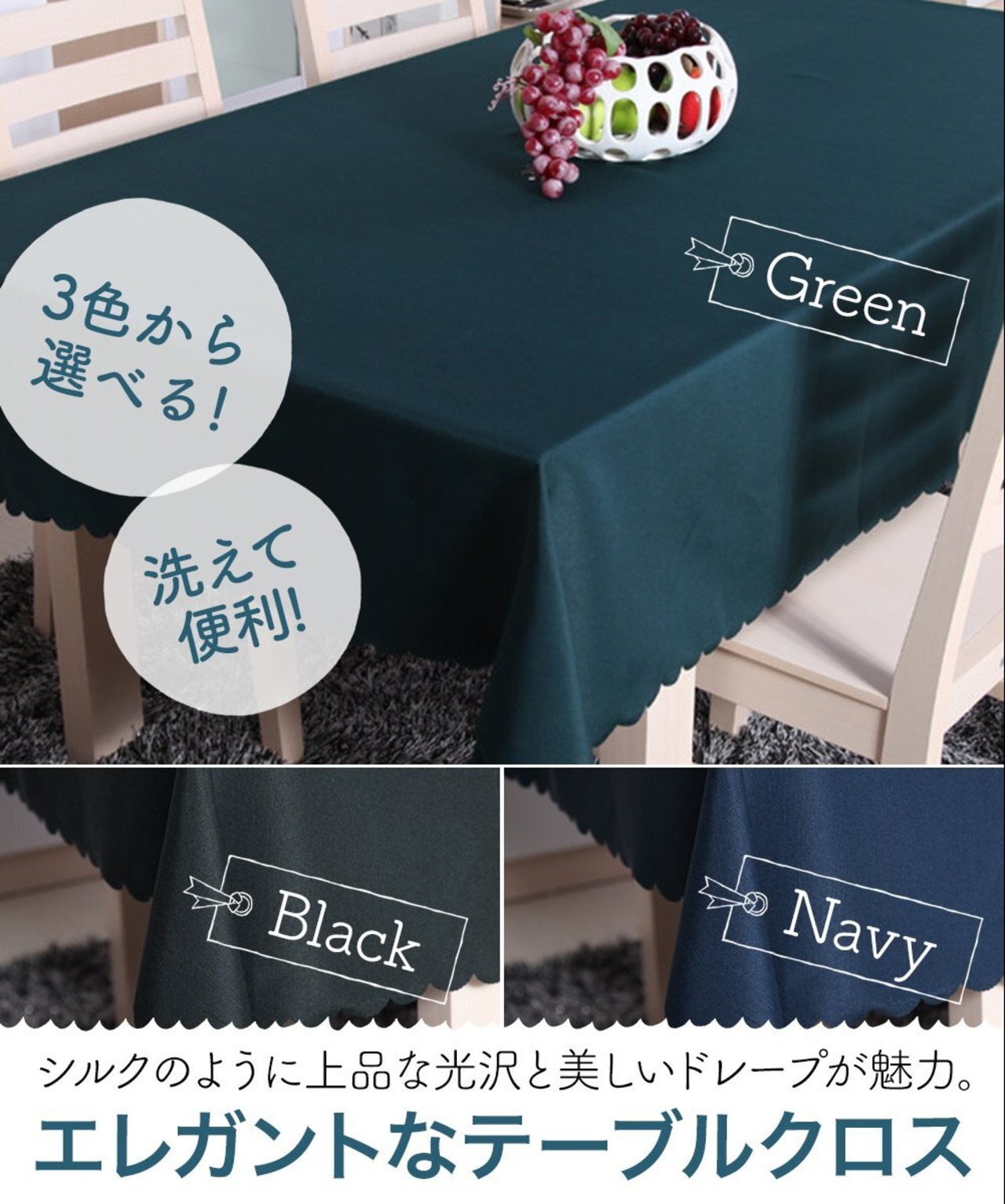 【高級感のある質感】シルクのような光沢とドレープが美しい厚手生地の無地テーブルクロス。