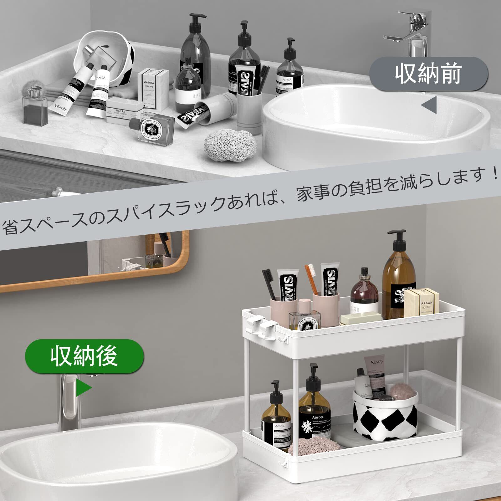 【多機能の2段収納ラック】 砂糖や塩などの調味料など、いろいろと収納できますよ。台所だけでなく、寝室、浴室、化粧品コーナー、書斎など、用途に合わせてご使用いただけ、収納力は抜群です。本製品の表面はプラスチック素材を採用していますので、周りの雰囲気との違和感がないです。
