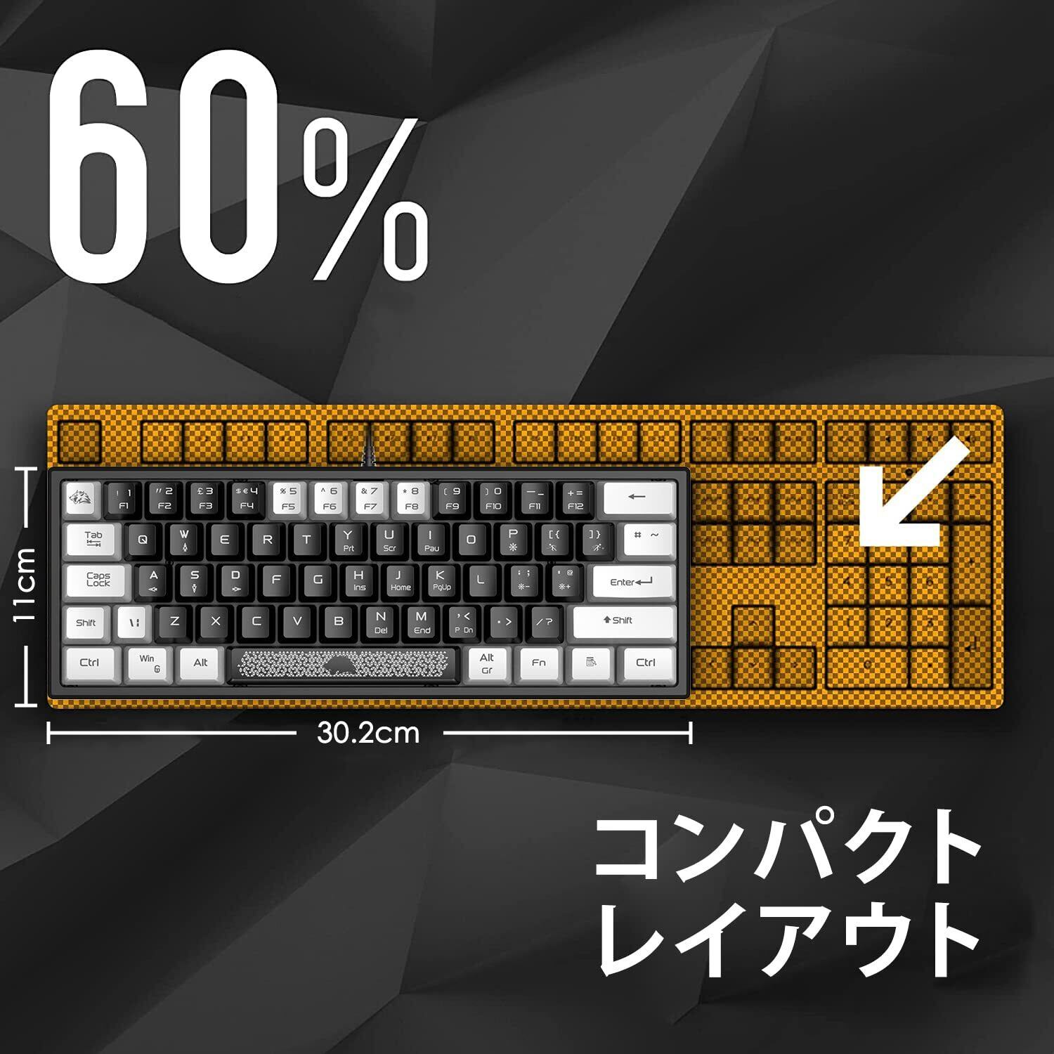 【コンパクトで人間工学デザイン】:全62キー小型モデル、サイズが30.2×11×1.6㎝で、フルサイズのキーボードのわずか60%しか占めていない。 マウスの動作に邪魔になれず、小さなスペースしか占めていないので、旅行、仕事や在宅に対し、持ち出しやすい選択です。 また、ABSキーキャップは人間工学にふさわしい曲線に設計されており、ゲームや仕事に対して最適な選択であります。