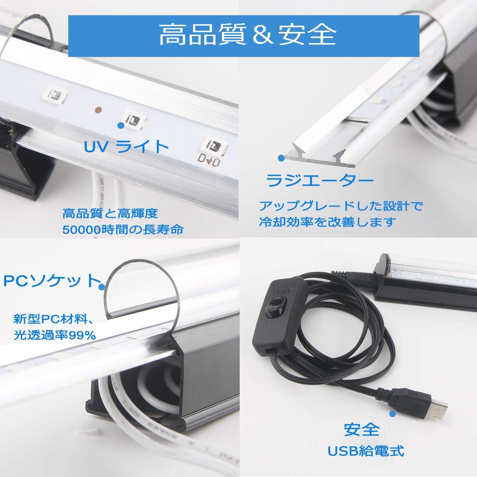 【ブラックライトー快活な雰囲気を演出する】仕様:32cm* 3.3cm * 2.3cm 重さ:約160g 照射角度;200度,材質:アルミ合金+ 高透過性PCカバー USBケーブル長さ: 1.6 M 消費電力: 10 W 波長: 385 ~410 nm 。超明るい紫色の光が、素晴らしいでエレガントな雰囲気を演出します。誕生日パーティー、ハウスパーティー、クリスマスパーティー、結婚式、ステージフロア、バー、ナイトクラブ、ディスコ、DJイベント、ライブショー野外フェス、店舗照明、に最適です。