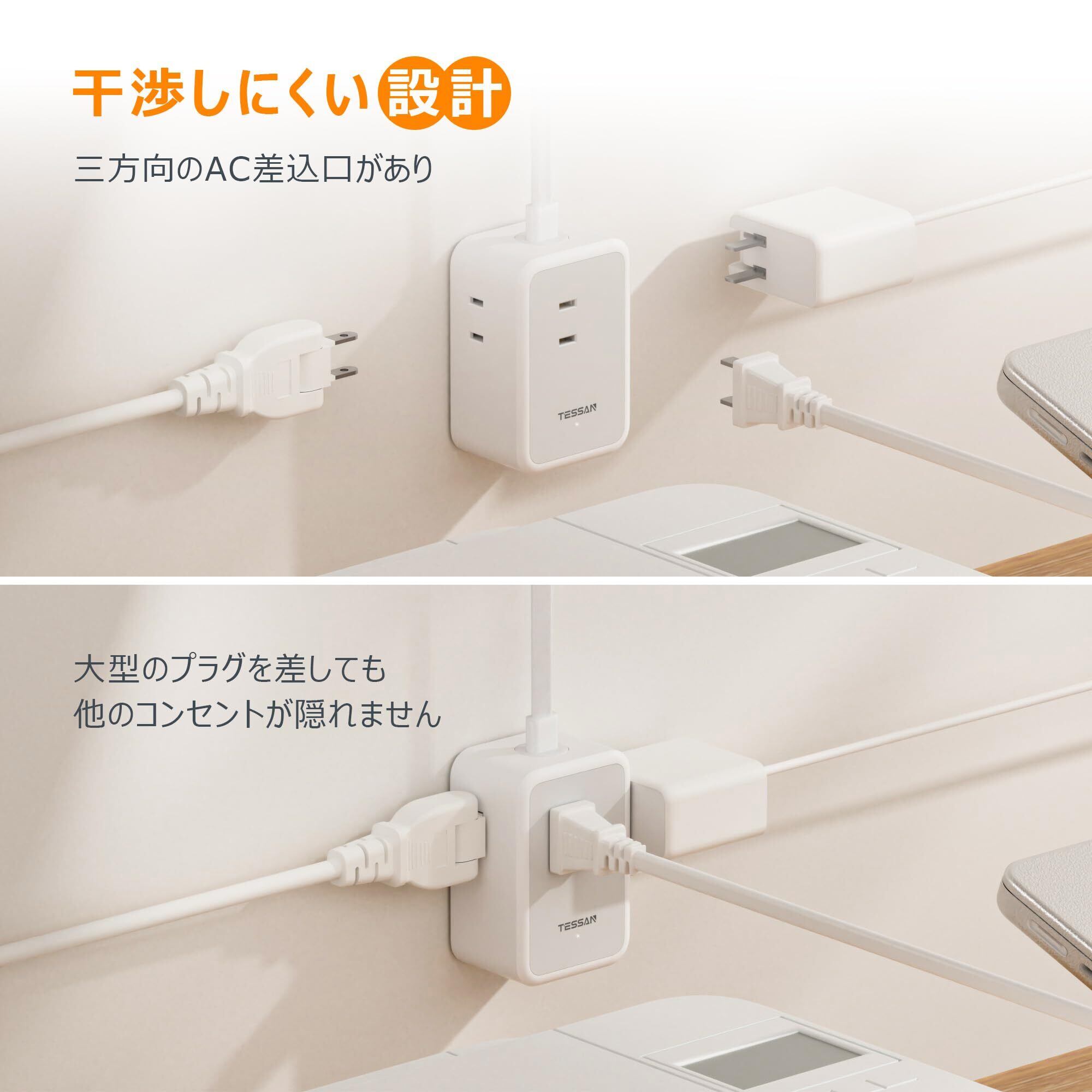 【干渉しづらい3方向設計】 このたこあしコンセント、3方向に分配されたACコンセントを採用しており、大型のACアダプターを同時に接続しても互いに干渉しません。ACコンセントは広い間隔で設計されており、大型のACアダプターもストレスなく接続可能。複数の機器を同時に使用する場合でも、ストレスなく接続可能です。