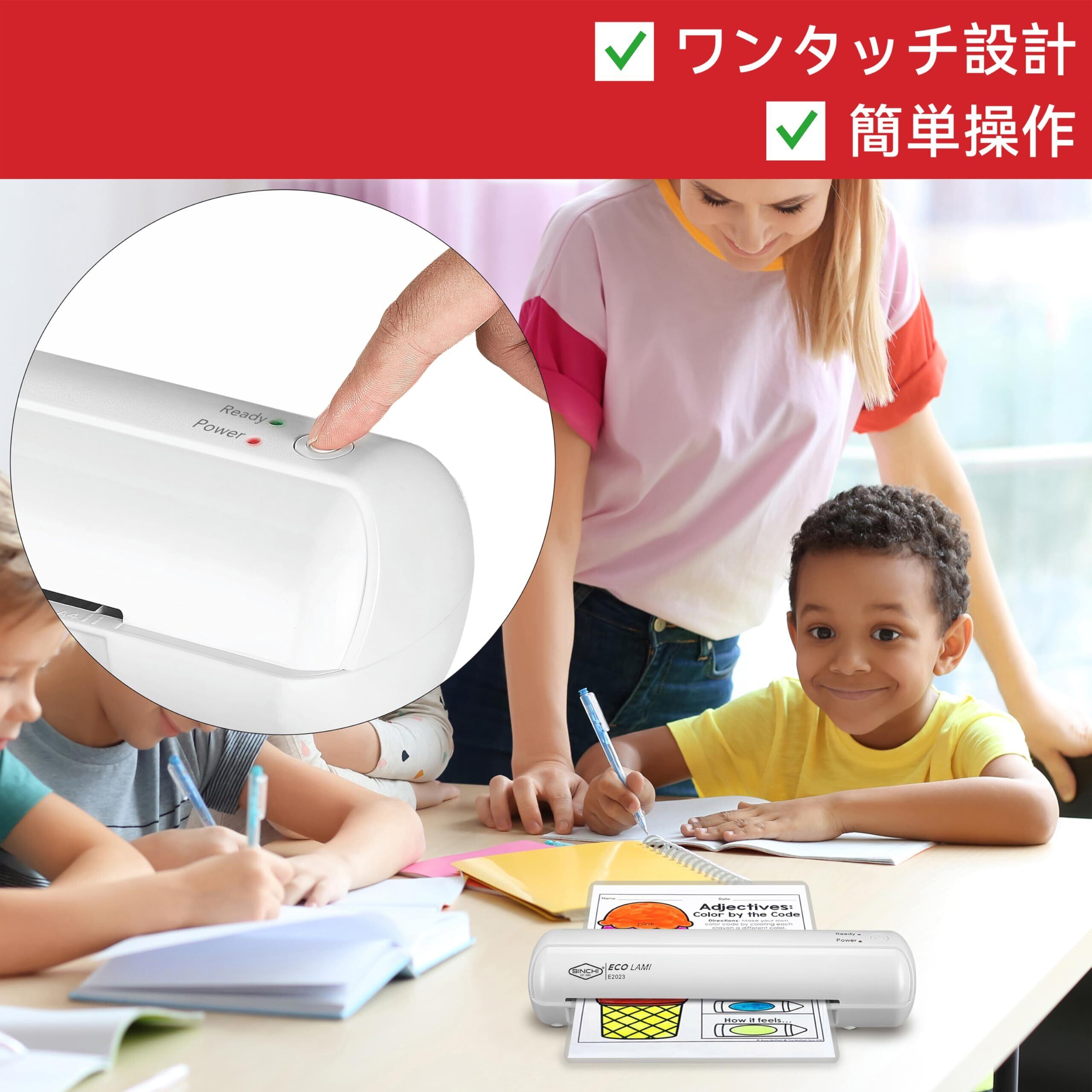 【スピーディーなラミネート】ウォームアップ時間はわずか3~5分。ラミネート速度は250~300mm/分(50・60Hz対応)、A4サイズのフィルムを約50~60秒で仕上げます。気泡ゼロ・しわゼロの美しい仕上がり。