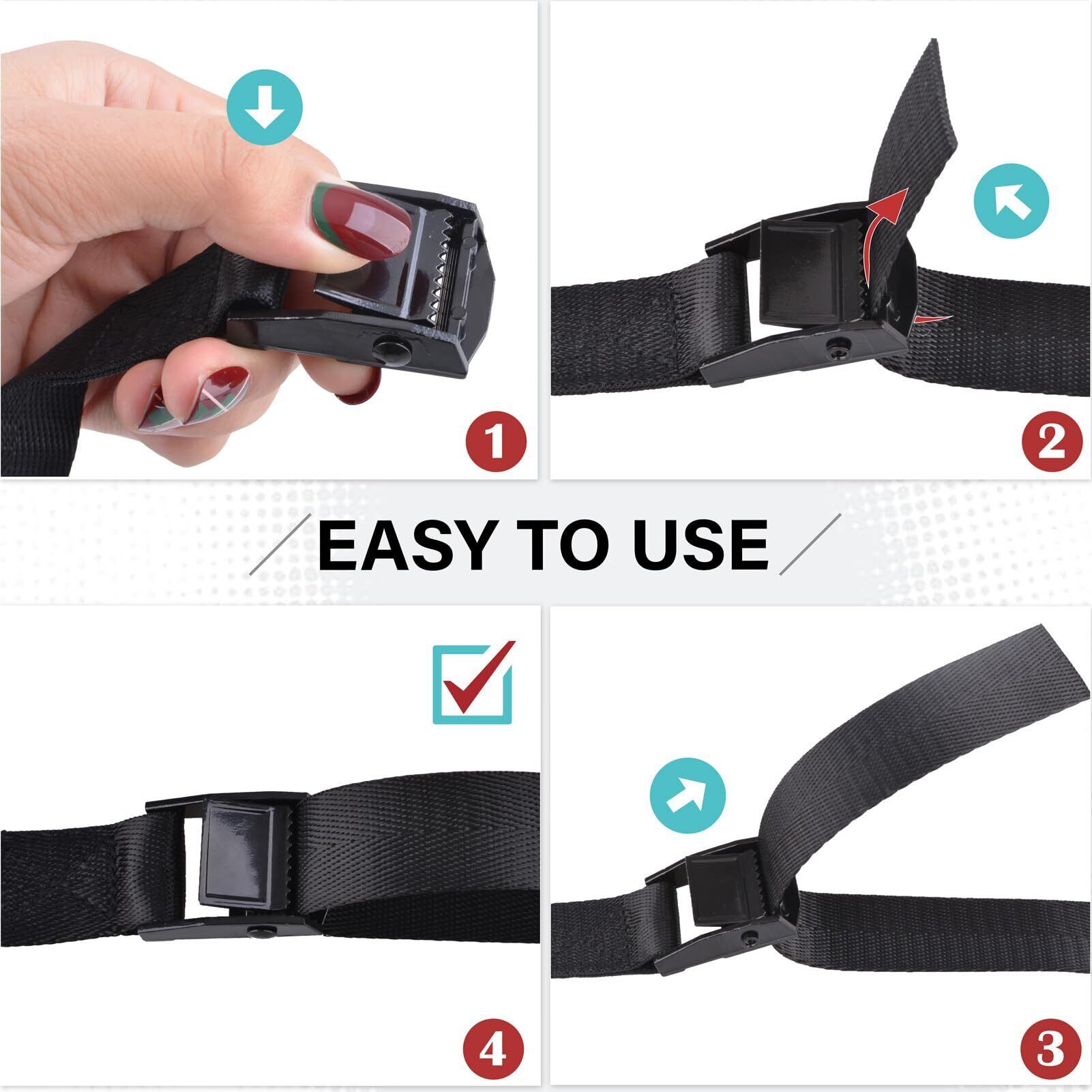 【機能】荷締バンドはカムバックルで調整、ベルトをバックルに通して強く引っ張ると締まる。簡単にしっかり荷物を固定できます