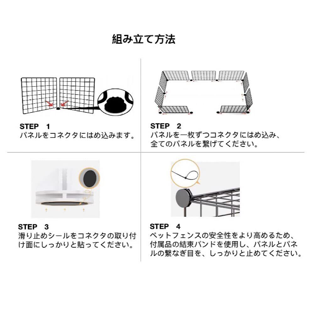 組み立て、お手入れ簡単 コネクタで軽量タイプのパネルをジョイントするだけなので、女性の飼い主さんでも、短時間で完成できます。メッシュパネルはコンパクト軽量タイプなので、使用しない際には、簡単に解体・収納できます。天井なしのペットフェンスなので、お掃除する際にも非常に便利です。パネルが汚れた際でも、表面を拭くだけなので、お手入れは簡単です。