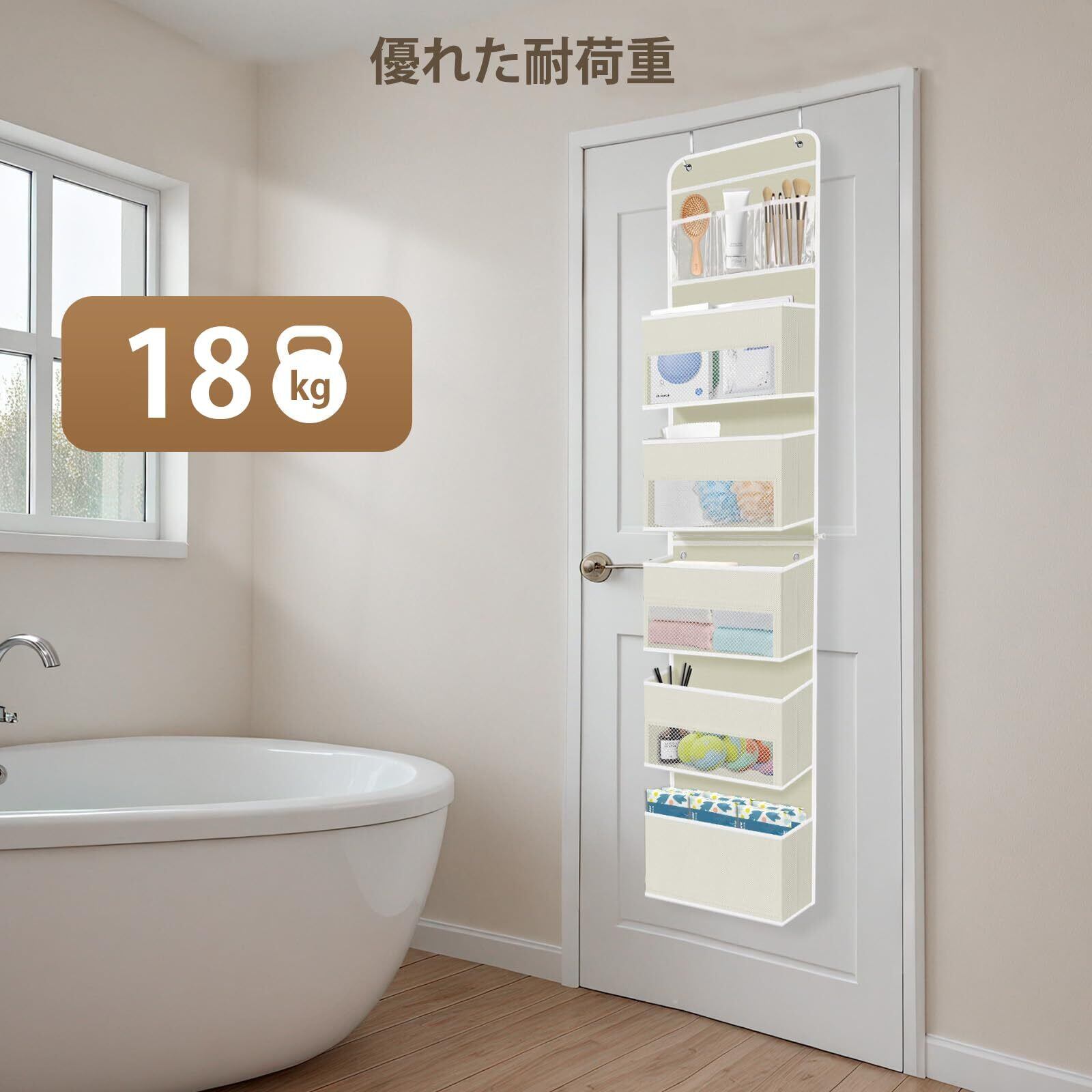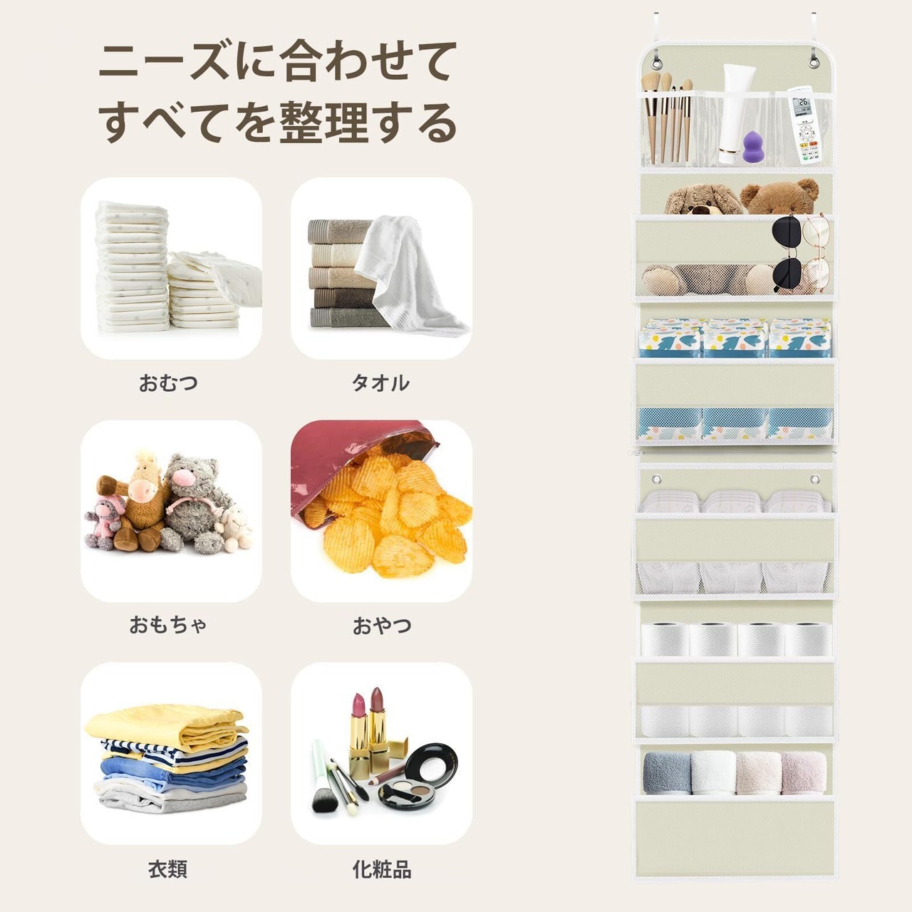 【様々な利用シーン】ドア掛け収納は玄関、寝室、子供部屋、脱衣場、洗面所、トイレなどだけでなく、幼稚園、保育園、オフィス、教室などにもご利用いただけます。おむつ/ベビー服/タオル/ドライヤー/入浴剤/化粧品/おもちゃ/雑誌/文房具/手芸用品などの小物の収納に便利です。