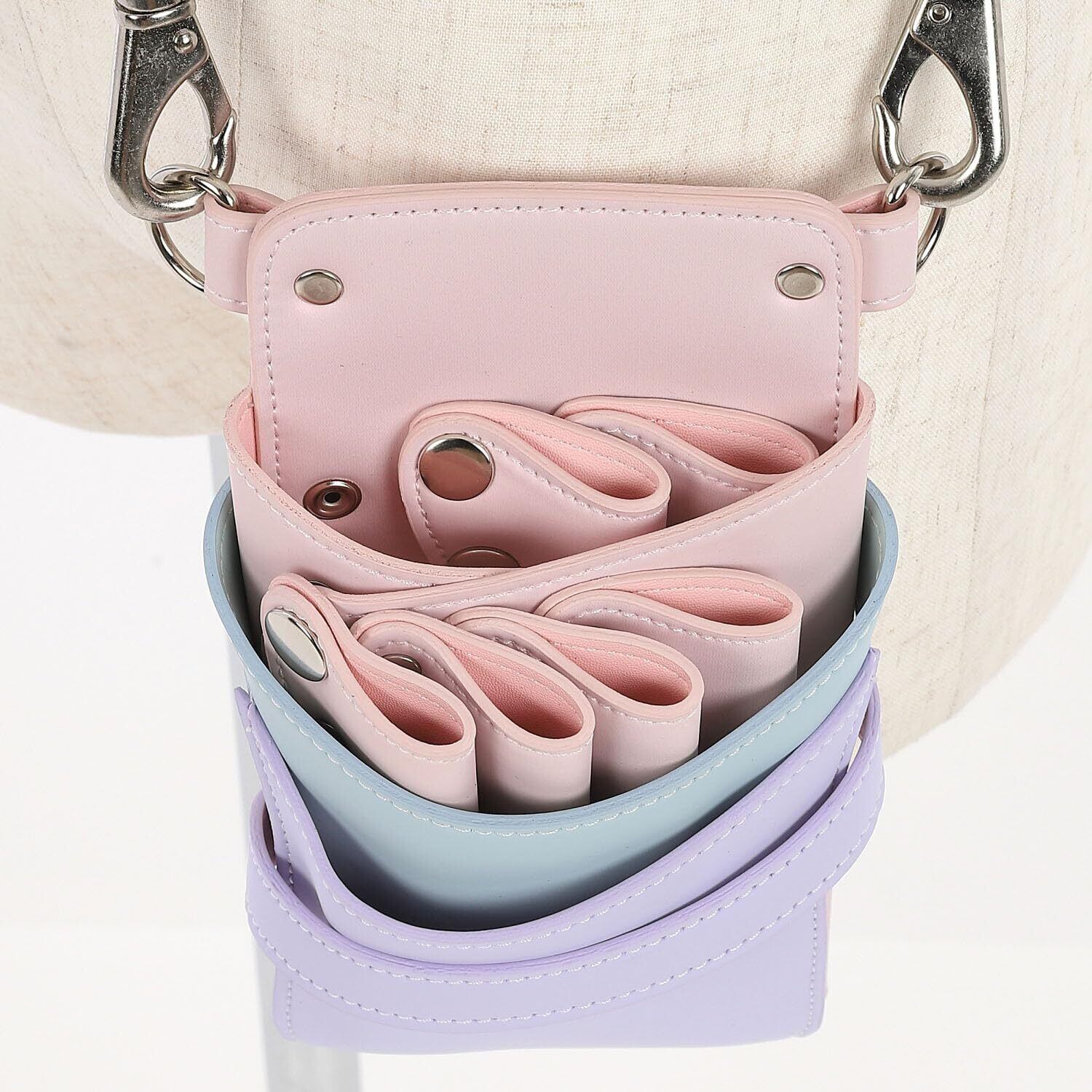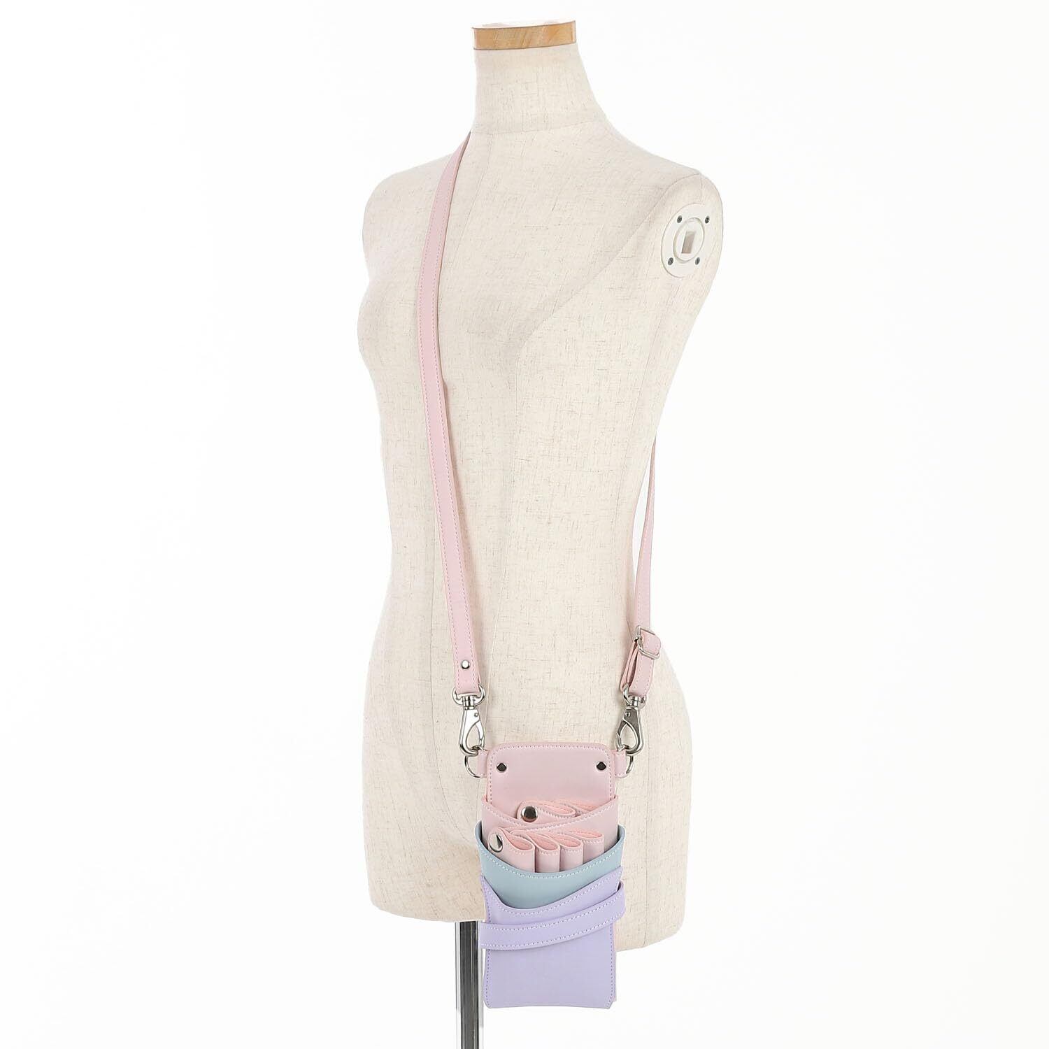マットな風合いのあるPUレザーを使用した6丁入れのシザーホルダーがついたコストパフォーマンスの高いシザーケースです。 後列のシザーホルダー2丁はそれぞれ取り外しが可能なので、用途やお好みに合わせてお使いいただけます。 スリムなデザインにこだわりつつ、ブラシやダッカールなどを挟むベルトやコームや小物を収納できるポケットなど機能性ももちろん重視しました。 また、底面がボタン式になっている他、各パーツが取り外せるので、日々のお手入れや掃除も簡単です。 専用ベルトは、腰巻きはもちろん肩掛けとしてもご利用いただけます。