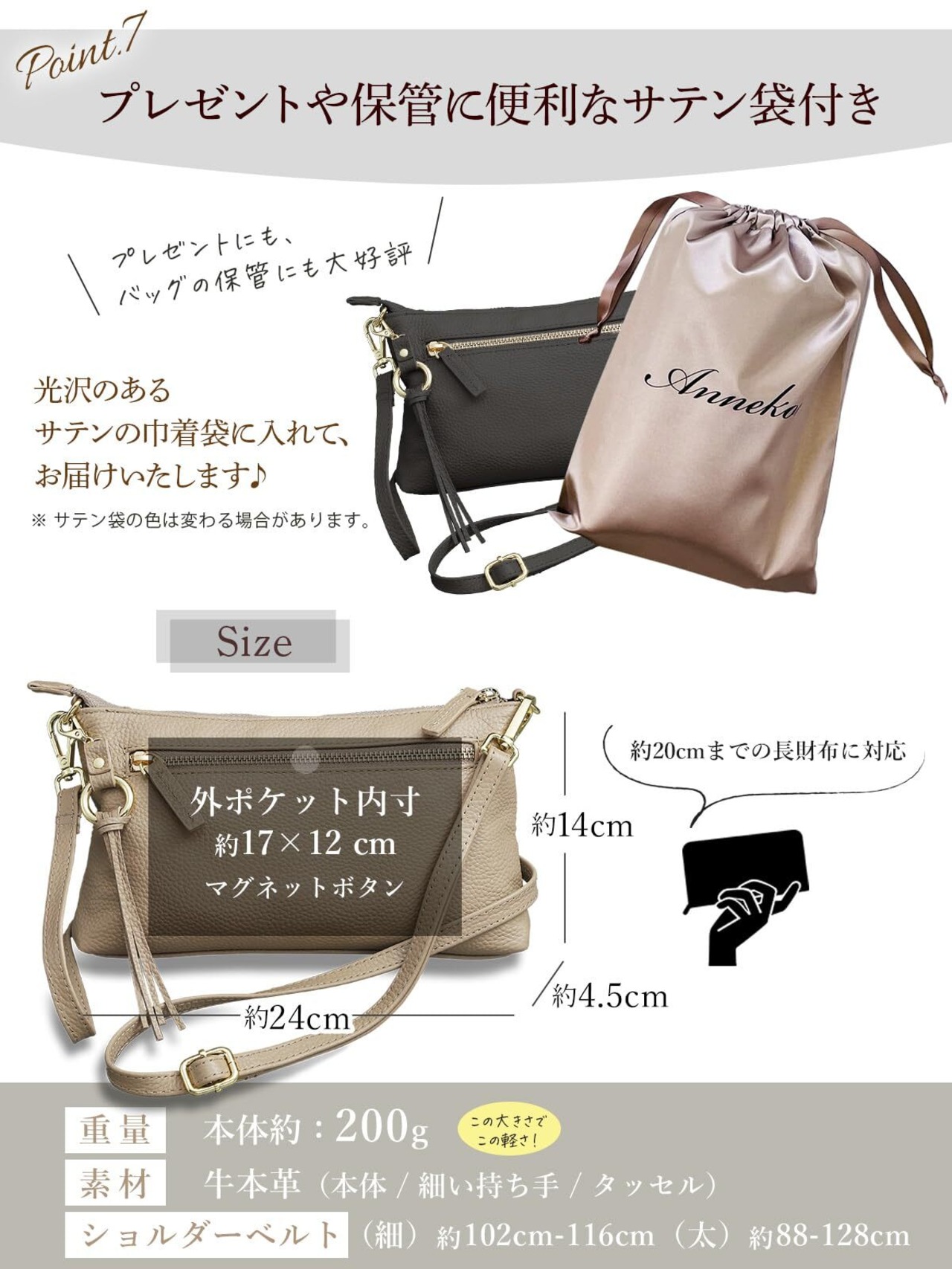 【コンパクトながら長財布も入る!】ちょっとした時にサッと斜め掛けでお出掛け。わずか200gのポーチは邪魔にならずお子様連れやお仕事時も両手を使う事ができ便利です。メインスペースは、真ん中に貴重品などを入れるファスナーポケットがあり、コンパクトながら横幅20㎝までの長財布も収納できる設計をした優れものです。(20cm以上や膨らんだ長財布は入らない可能でもございます)
