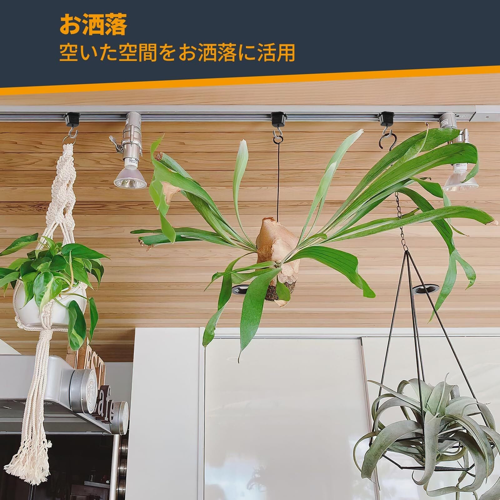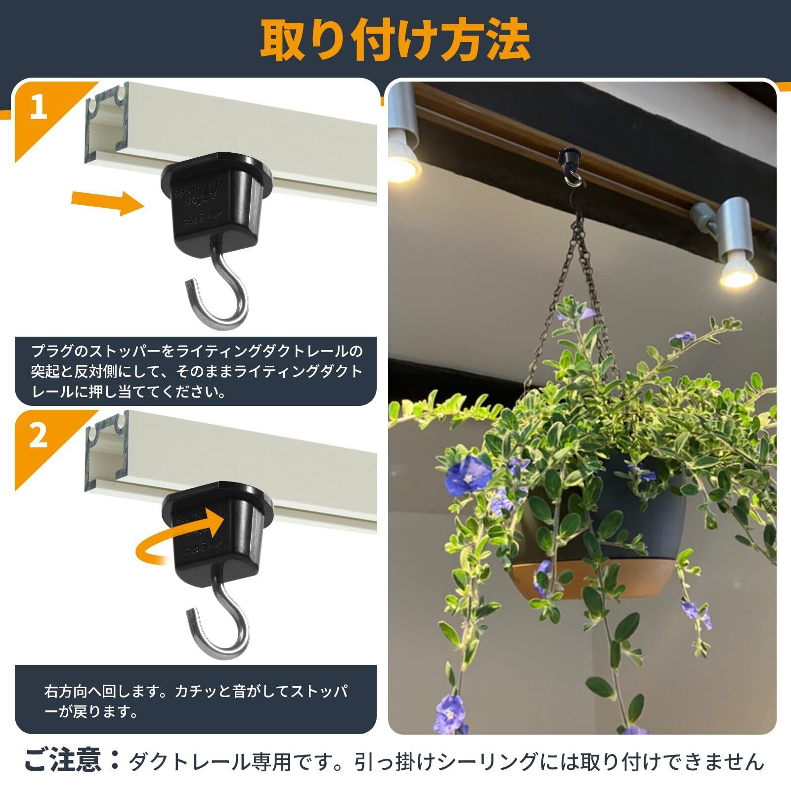 2、【特長】ダクトレールにはめて半回転させるだけなのでとても簡単に設置できます。ドライフラワーのスワッグなど軽いものを引っ掛けるのに使用しています。フックがあると色々アレンジできますし、フックにグリーンを飾ると部屋の雰囲気も変わってなかなか良いですね。