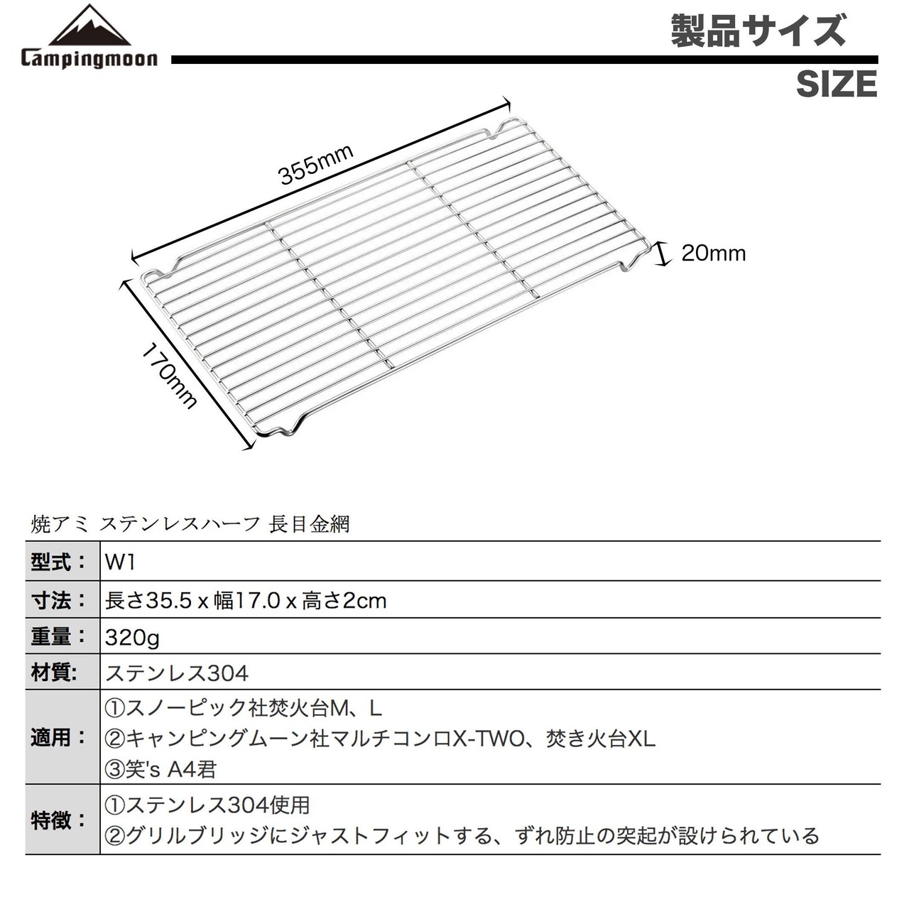 キャンピングムーン(CAMPING MOON)長目金網 焼アミ ステンレスハーフ PRO W1