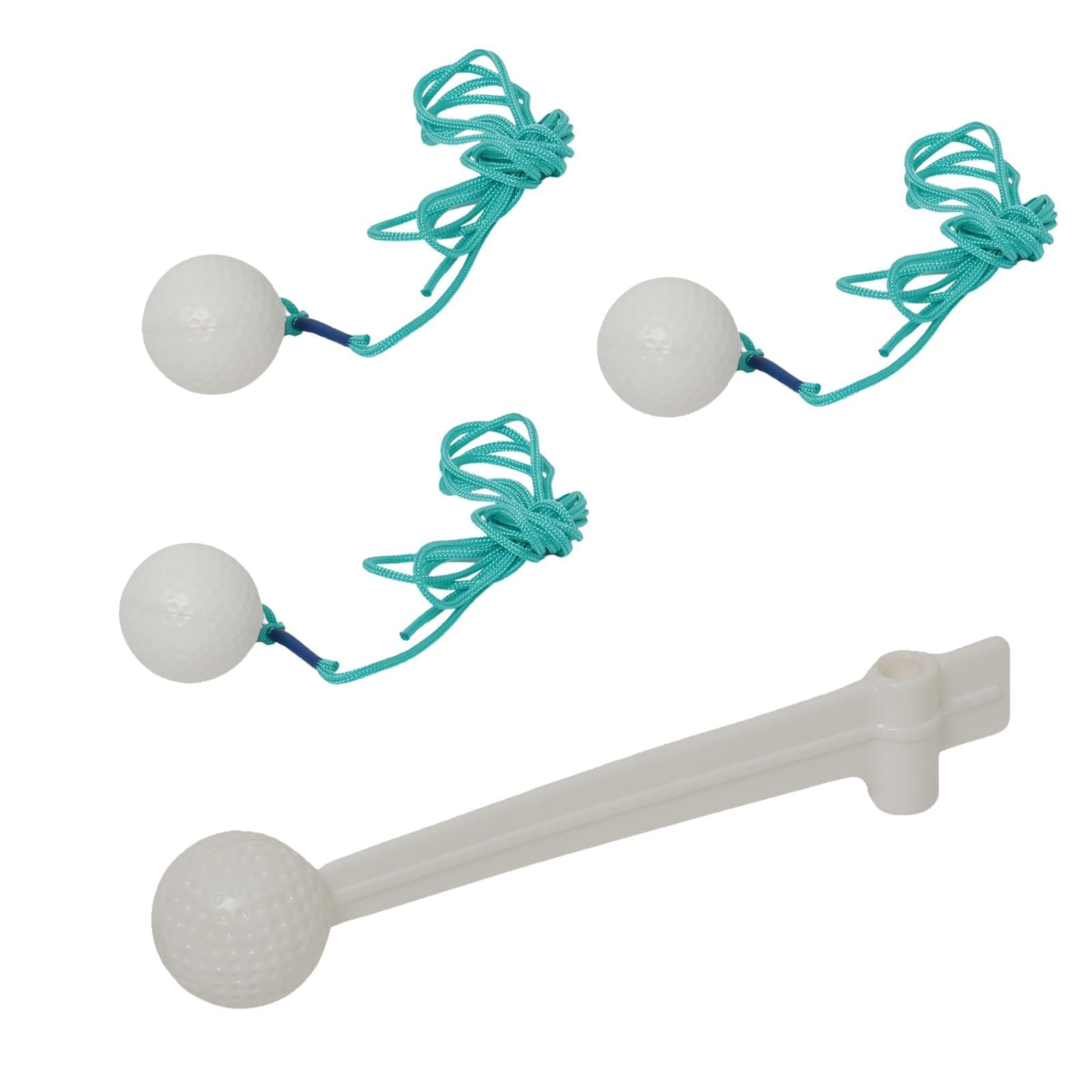 紐付きボールの紐の長さは約2m。テープで固定されているので解けにくく、しっかりと練習できます。スペアアームは柔らかく打感が良い仕様。自宅の庭先で練習場さながらの練習が可能です。