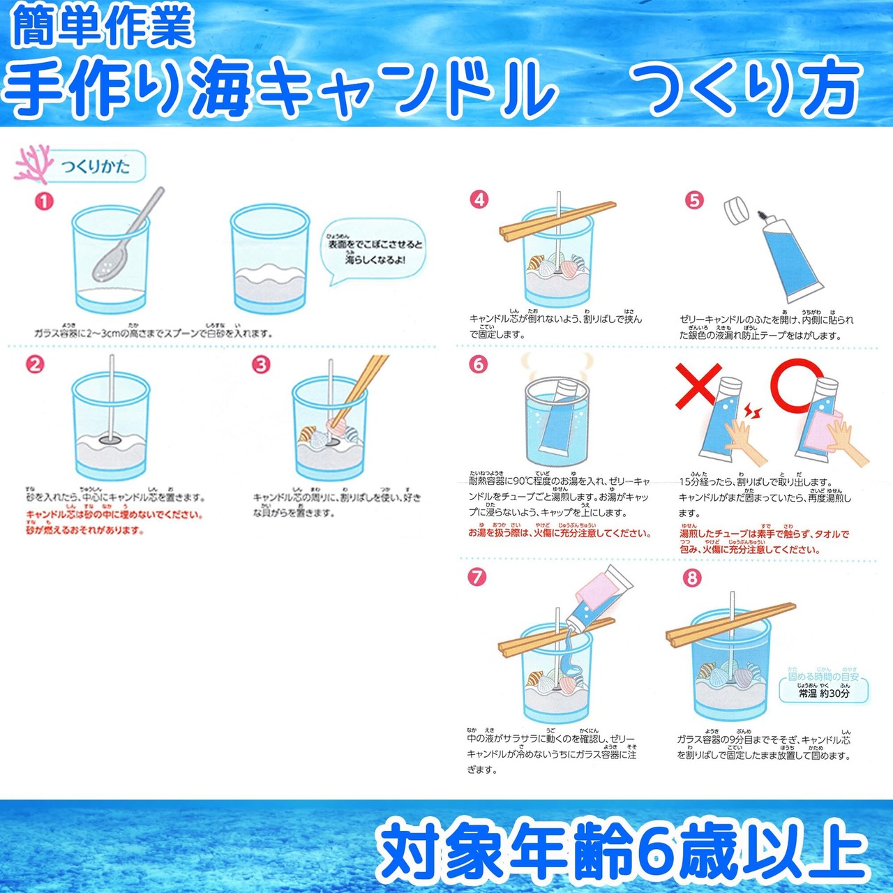 皆様が思い描く海をイメージした キャンドル は出来るかな⁉ 手作りゼリーキャンドル1箱でキャンドルを1個作れます。ガラス容器に白い砂を入れ キャンドル芯 を立て 貝がら を飾ってください。それができれば、湯煎したブルーの ゼリーキャンドル を流し入れてください。あとは、ゼリーが固まったら完成です。作業自体は、簡単です。
