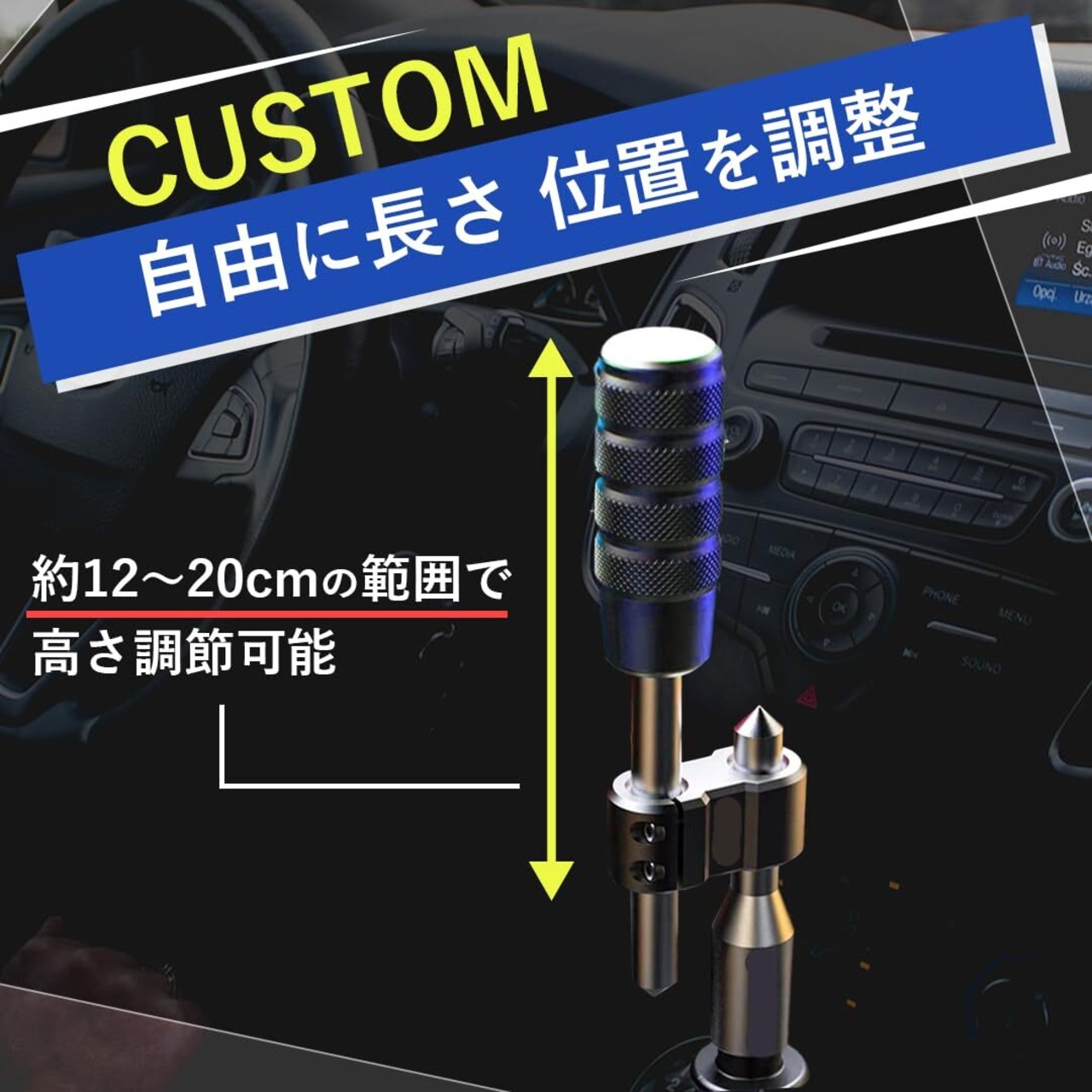 【範囲が広い】このエクステンションは、シフトノブを約12cmから20cmの範囲で調整可能でき幅広い車種に対応できます。さらに、ノブの位置を軸の周りで回転させることで、ハンドルからの距離を自分好みにカスタマイズできます。本体は頑丈で軽量なアルミニウム合金製で、長期間にわたり信頼性の高い性能を提供します。シンプルながらも高級感あふれるブラックカラーは、乗用車から大型車両まで幅広く似合い、車内のイメージを洗練させます。