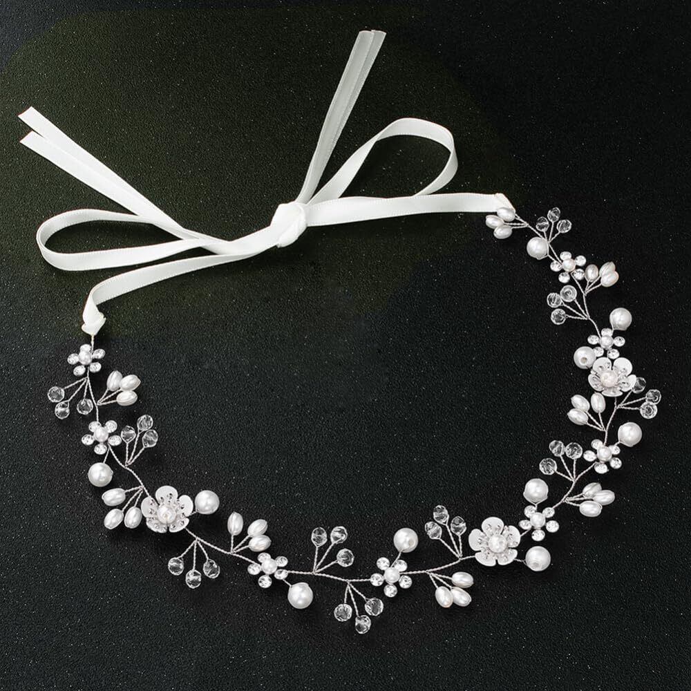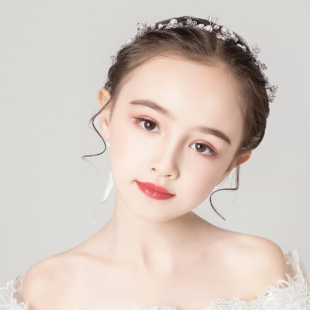サムコス 髪飾り 花 パール 花かんむり リボン ホワイト ヘッドドレス クリスタルビーズ 花冠 ヘアアクセサリー 結婚式 発表会 披露宴 卒業式 パーティー ダンス 和装 撮影 写真 子供 大人用 (A,シルバー)