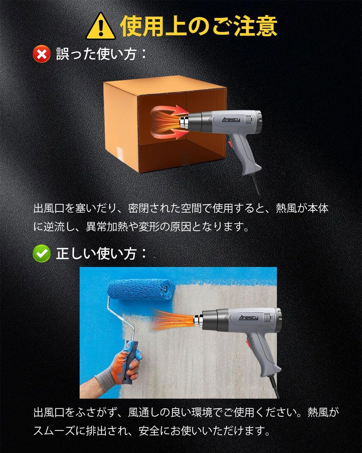 日本規格で安全安心: ①日本PSE認証済みヒートガン(安全安心)を取得済みヒートエアガンでございます。②電源:AC100V 50/60Hz(日本のコンセントに対応)。③12時間以内にアフターサービス対応