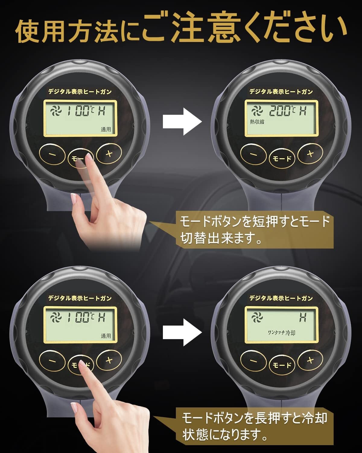 作業モード: ヒートガンの「II」段階目のスイッチでは、通常モード、熱収縮モード、フィルムモード、溶接モードが使えるようになります。調整単位は+-のボタンで10度単位で可能、-+の3秒の長押しで100度単位で調整できる。特に初心者にオススメです。