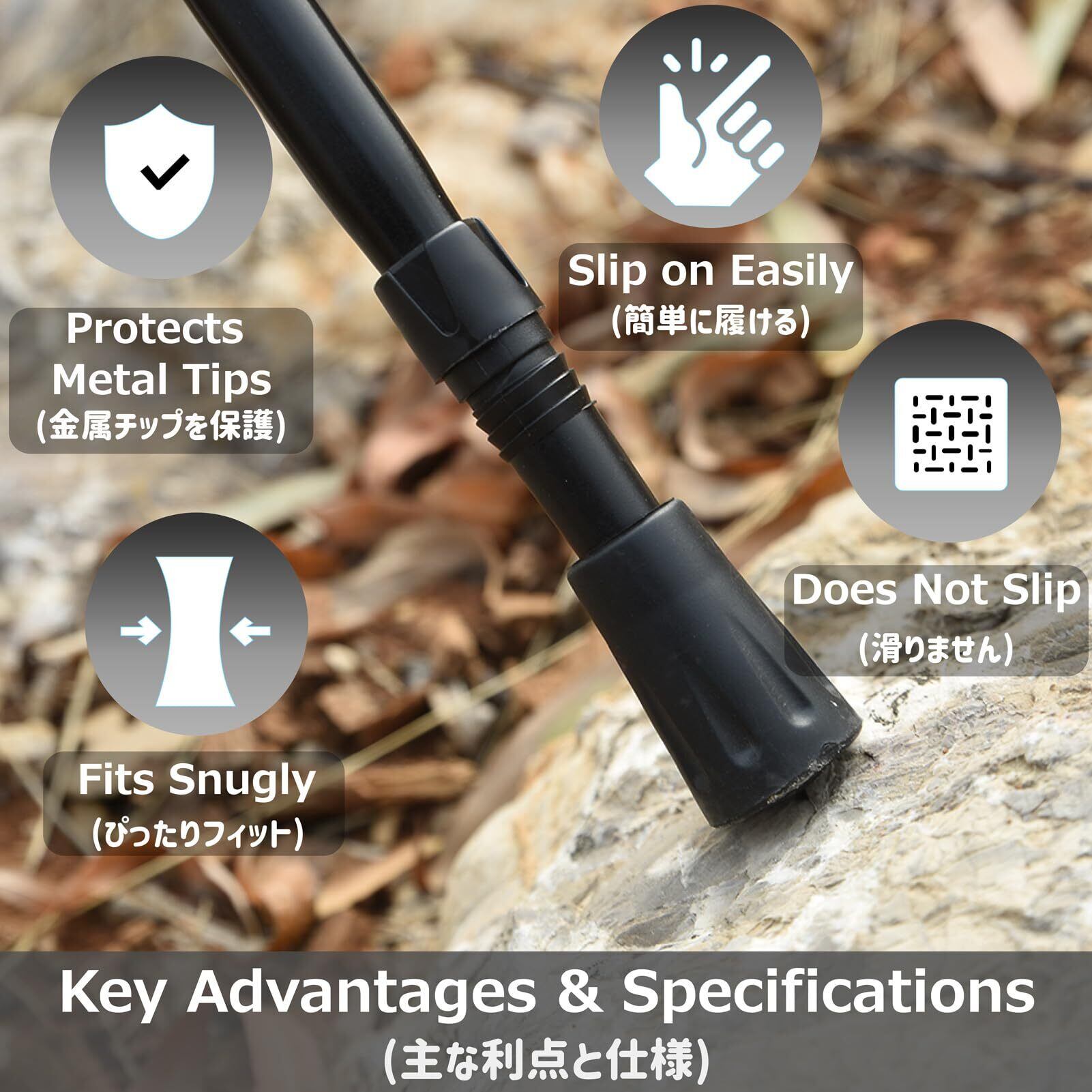 【特徴】- 滑り止め、トレッキングポールの先端保護、衝撃吸収、手の負担を減らす