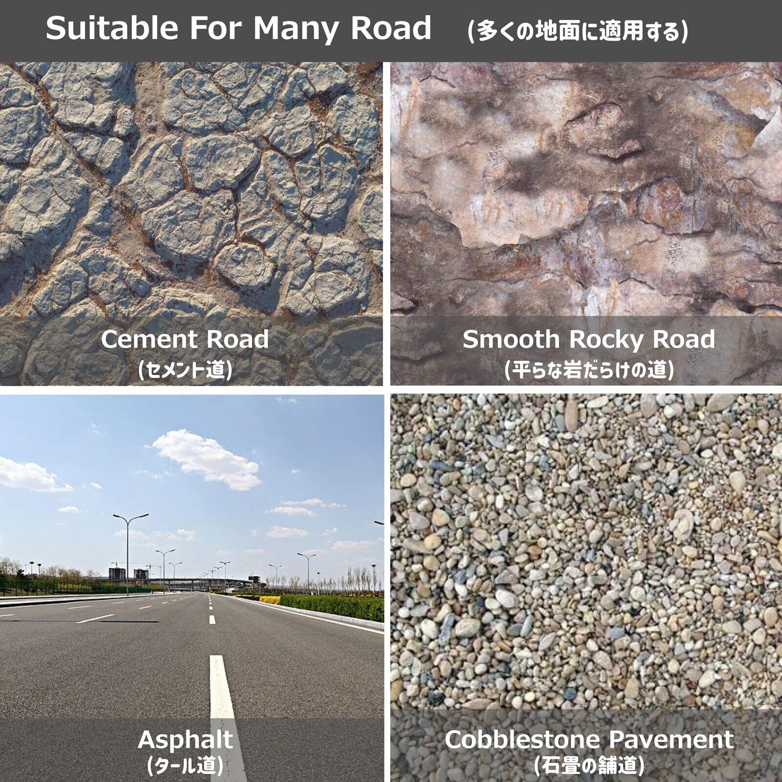 【適用】- セメント道、岩だらけの道、タール道、石畳の舗道、砂利道など様々な地面でご利用いただけます