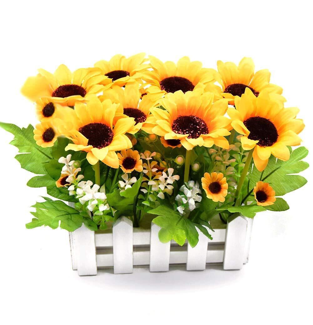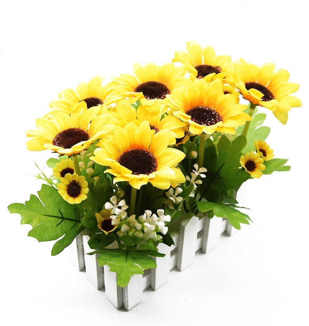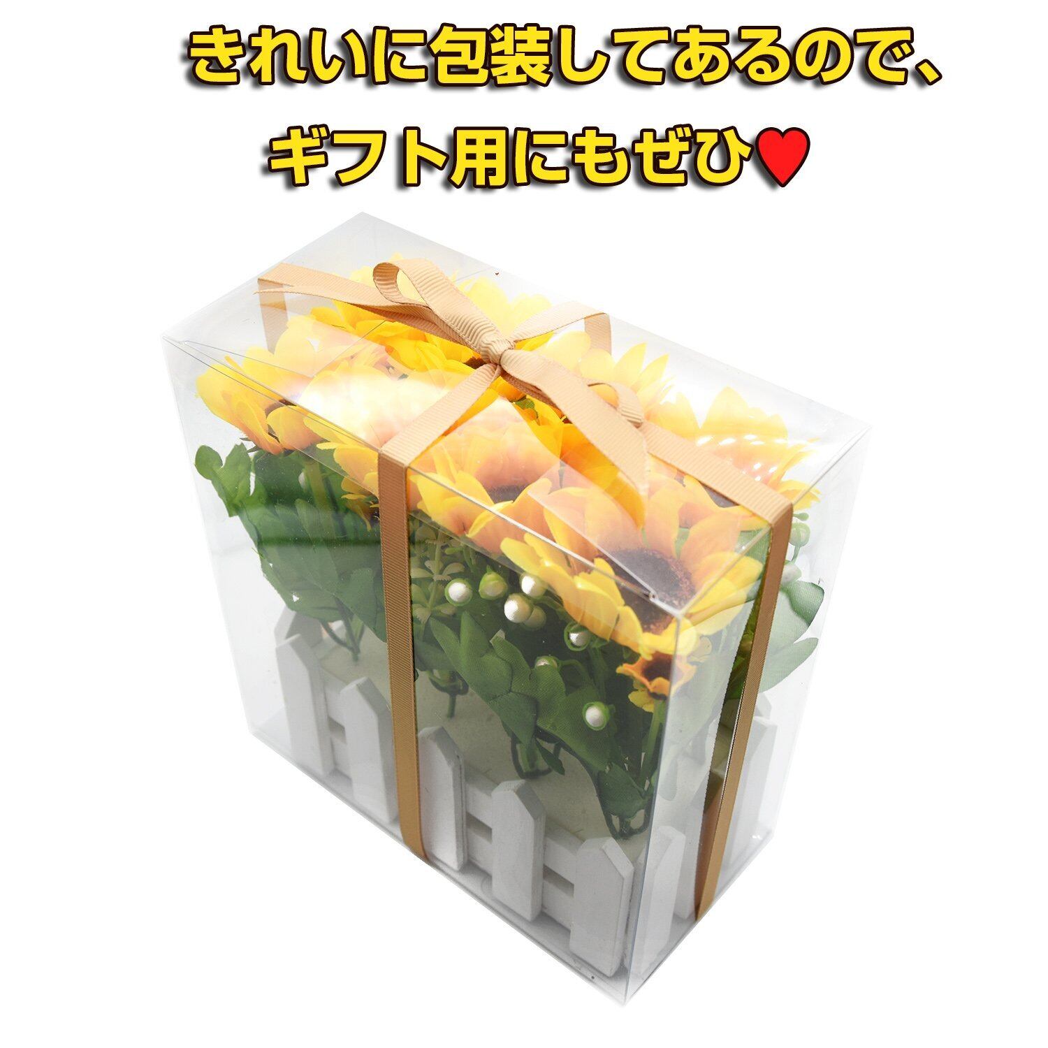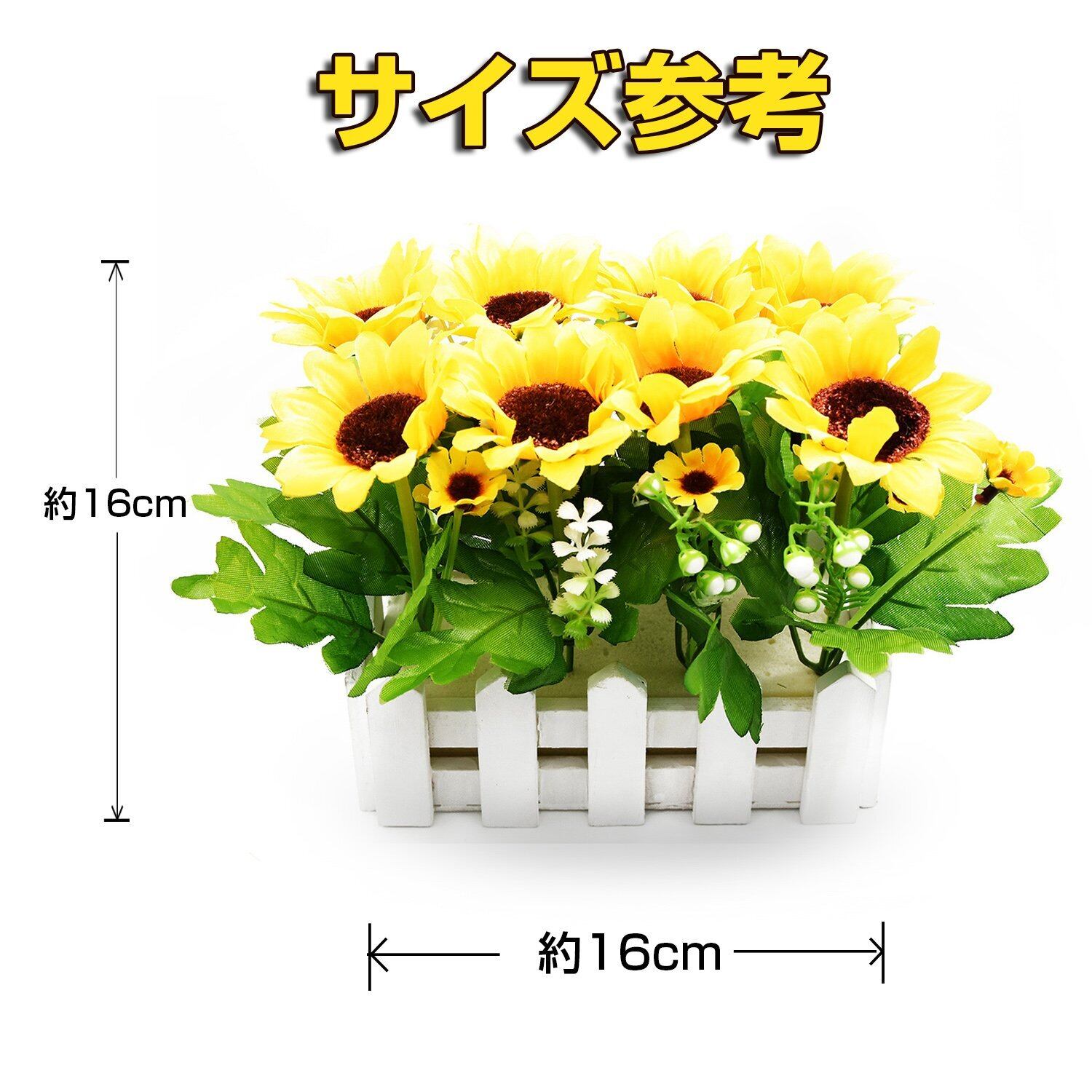 ️セット内容:造花のひまわり+木製入れ物 全体のサイズ 約長さ22cm×高さ16cm、大きなヒマワリ(8個)の直径 約7cm 小さなヒマワリ(10個)の直径 約2.5cm、木製入れ物のサイズ:長さ16cm××幅7.5cm×高8cm