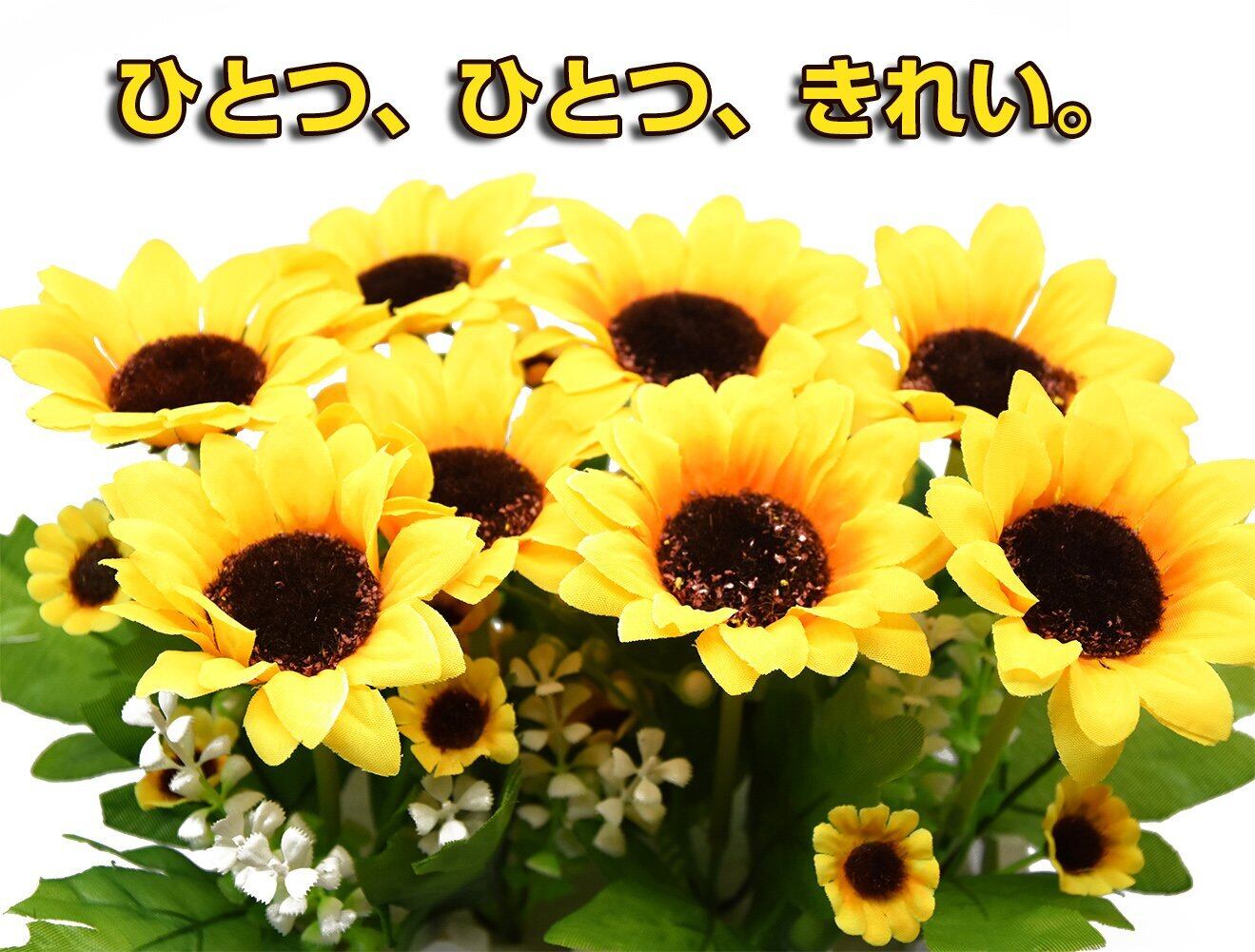 ️BEADYから鮮やかなひまわりの造花が登場。入れ物も付きで、よりきれいに。水やりやお手入れ不要の花束。花粉アレルギーの方も安心。