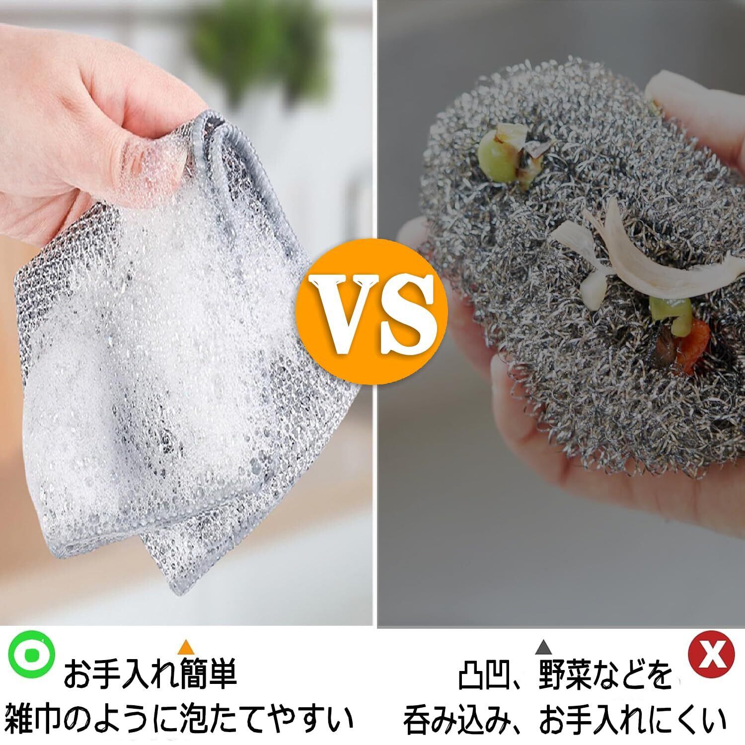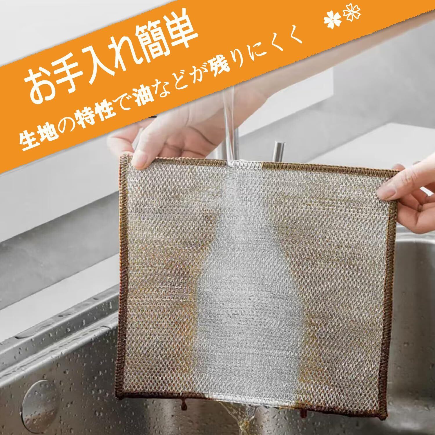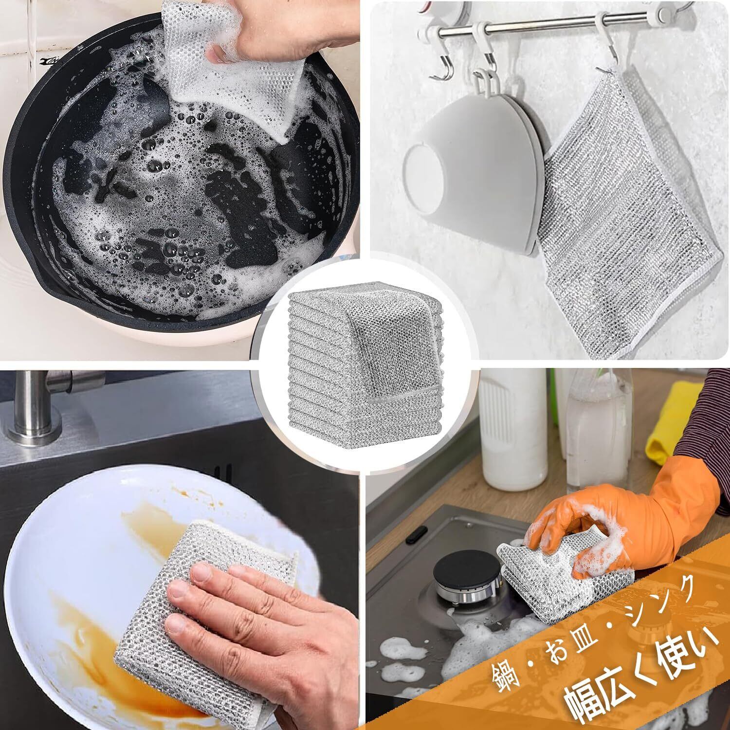 【編みでメッシュデザイン、泡立て、速乾!】キッチンクロスはステンレスを採用され、四角布の形加えてメッシュデザインで少量の洗剤があれば、泡が豊富、その他に、油脂の残留を防ぎ、べたつきを低減し、流れ水で直接洗え、急速に乾かし、台所の清潔さと乾燥を保つことができ、便利なキッチンクロスです。