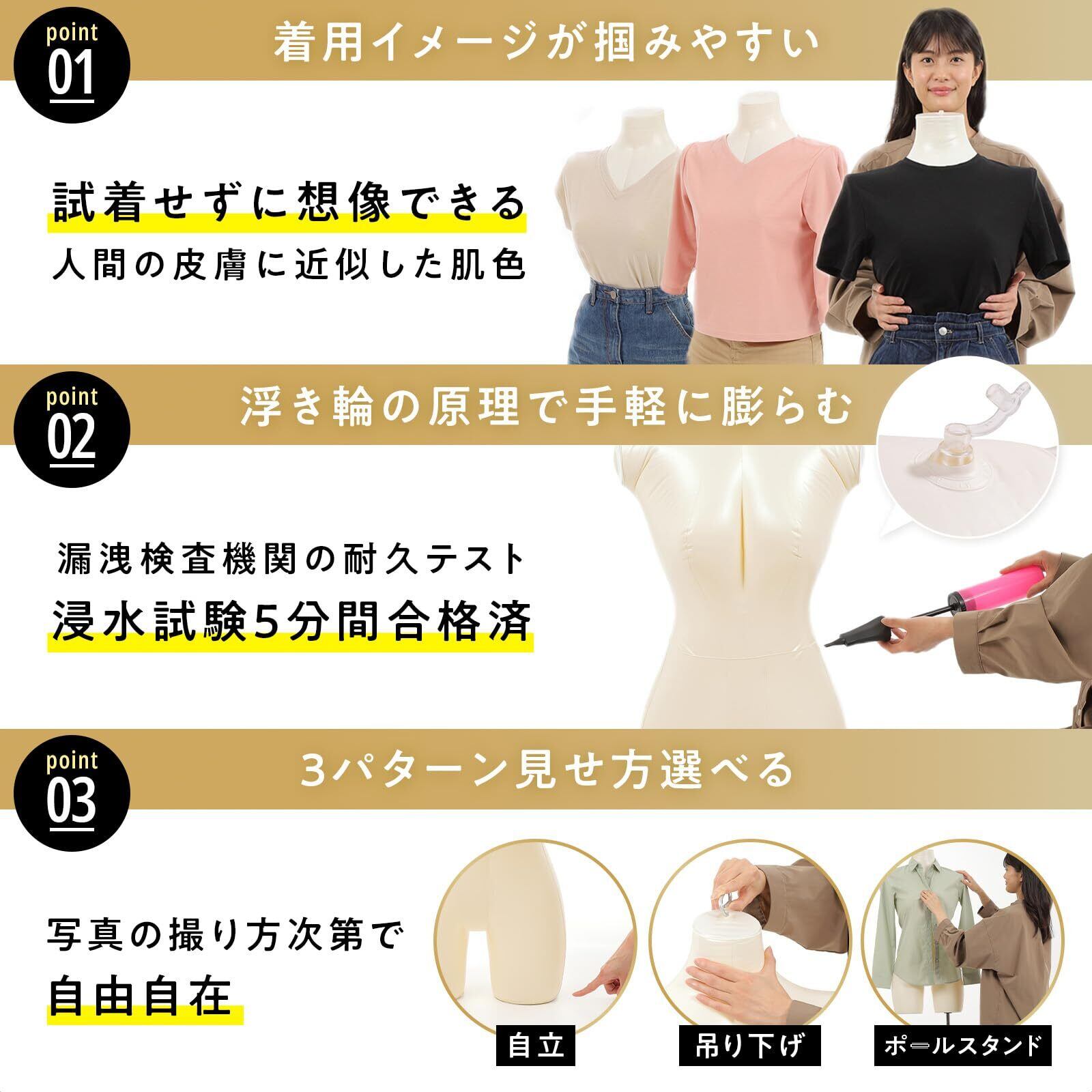 【機能】使用方法は簡単。空気口から空気入れて膨らませるだけ。モデル体型の空気式マネキン(トルソー)が完成です。エアーマネキンのため、使用後はボディの空気を抜けば収納スペース不要。持ち運びにも便利です。