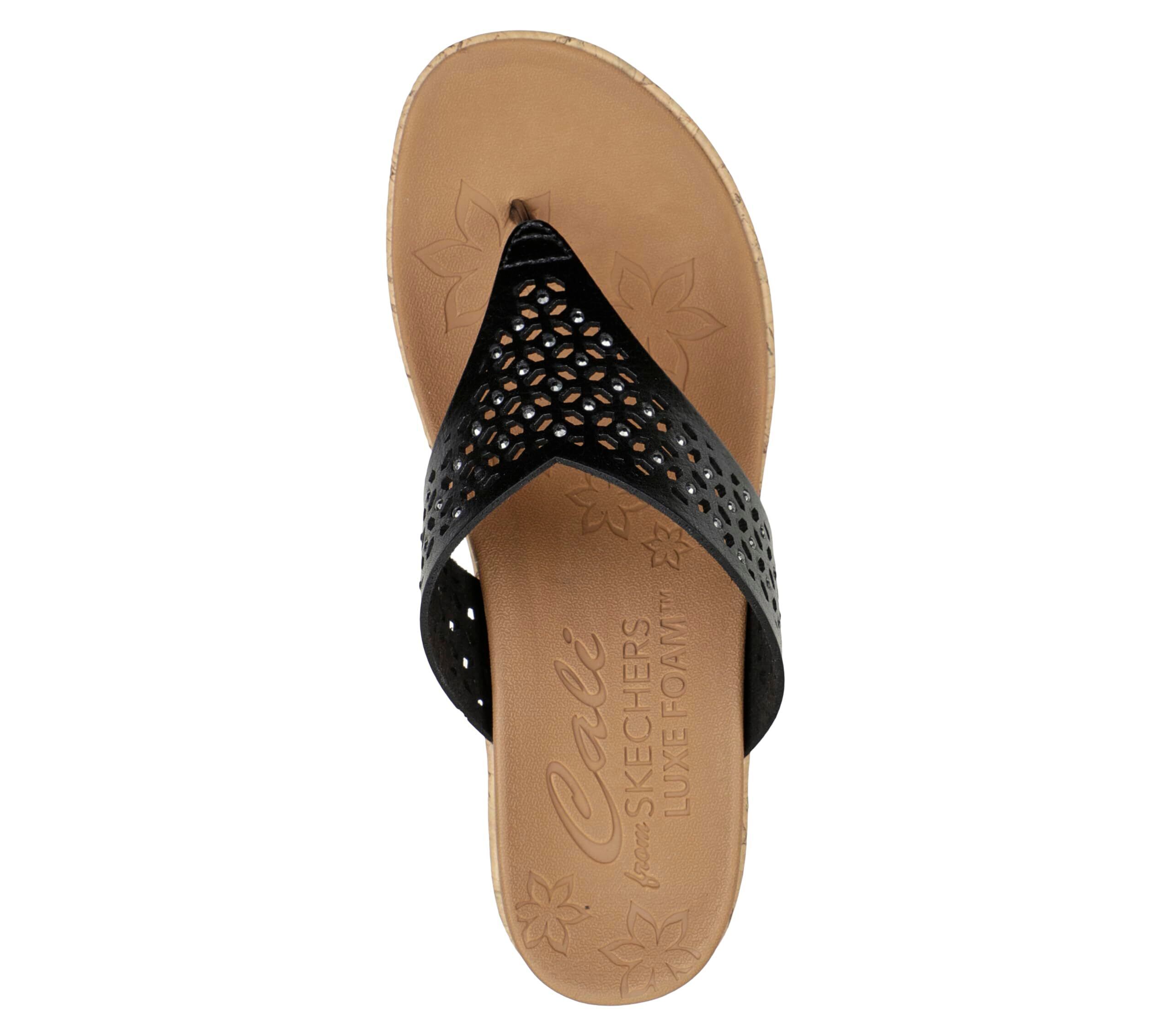 フェミニンなスタイルと最高の履き心地を兼ね備えたSkechers Cali Beverlee - Pier Stroll スケッチャーズ カリ ビバリー - ピア ストロール。ラインスタッド装飾を施した合成素材のカットアウトアッパーに、Luxe Foam(ラックス フォーム)フットベッドを組み合わせたトングスタイルのウェッジサンダル。
