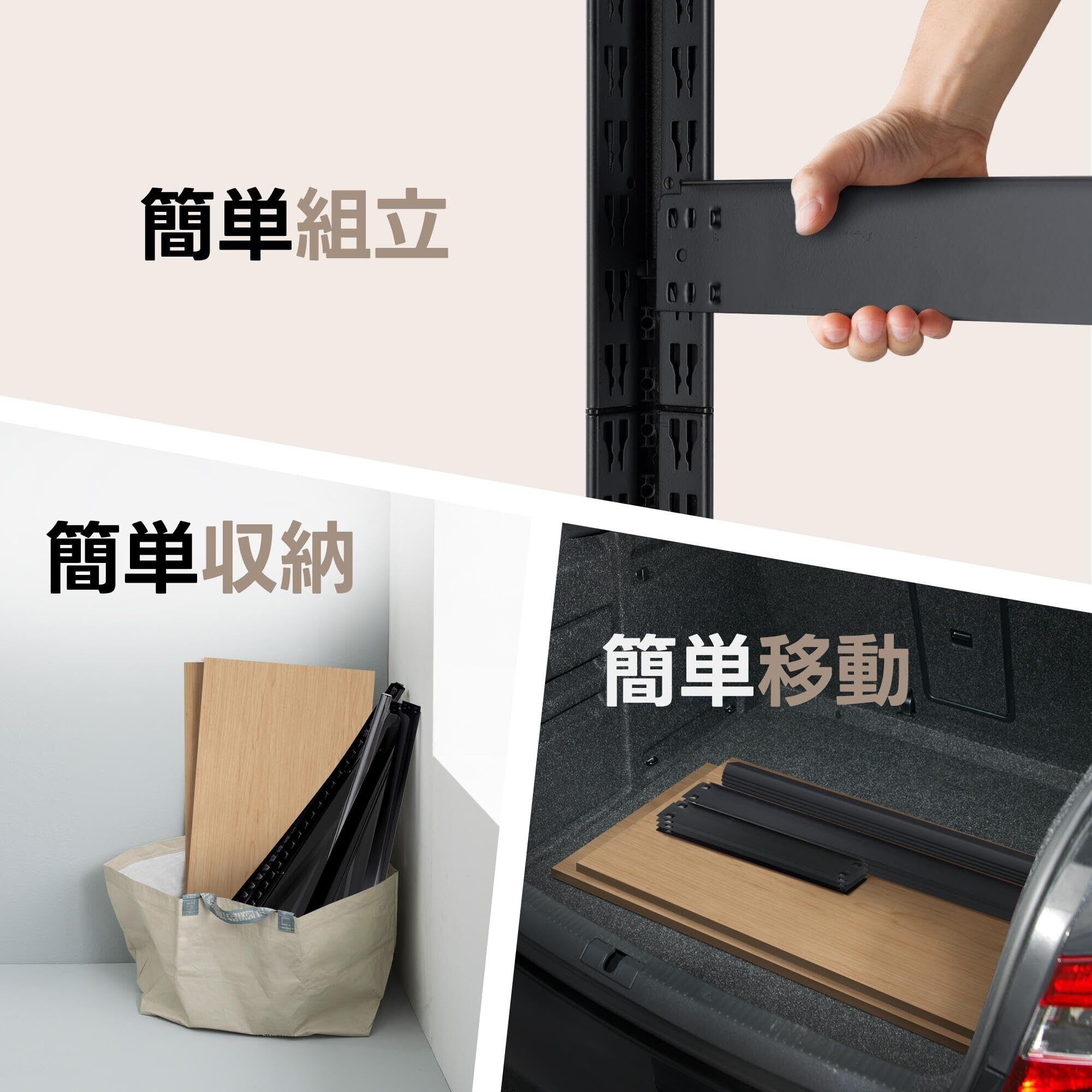 簡単な組み立て&高さ調整可能:ワイヤー棚のようにプラスチッククリップなどの部品は必要ありません。棚受を支柱穴に押して固定するだけです。一回の組立で多くのスペースを取らずに多くの追加収納スペースを作ることができます。棚の各段は柱の内部のシークレットホールに3cm間隔の溝があり、物の大きさに合わせて棚を上下に自由に調節でき、ご希望に合わせた収納スペースが作れます。