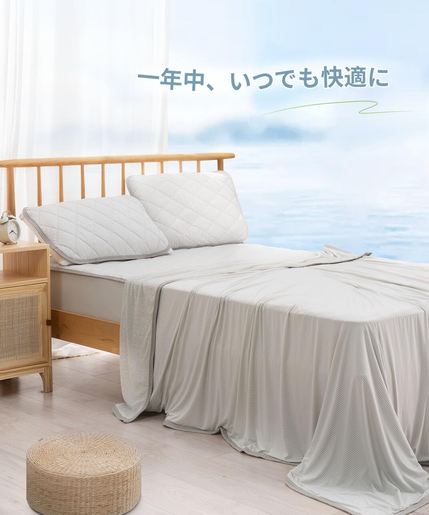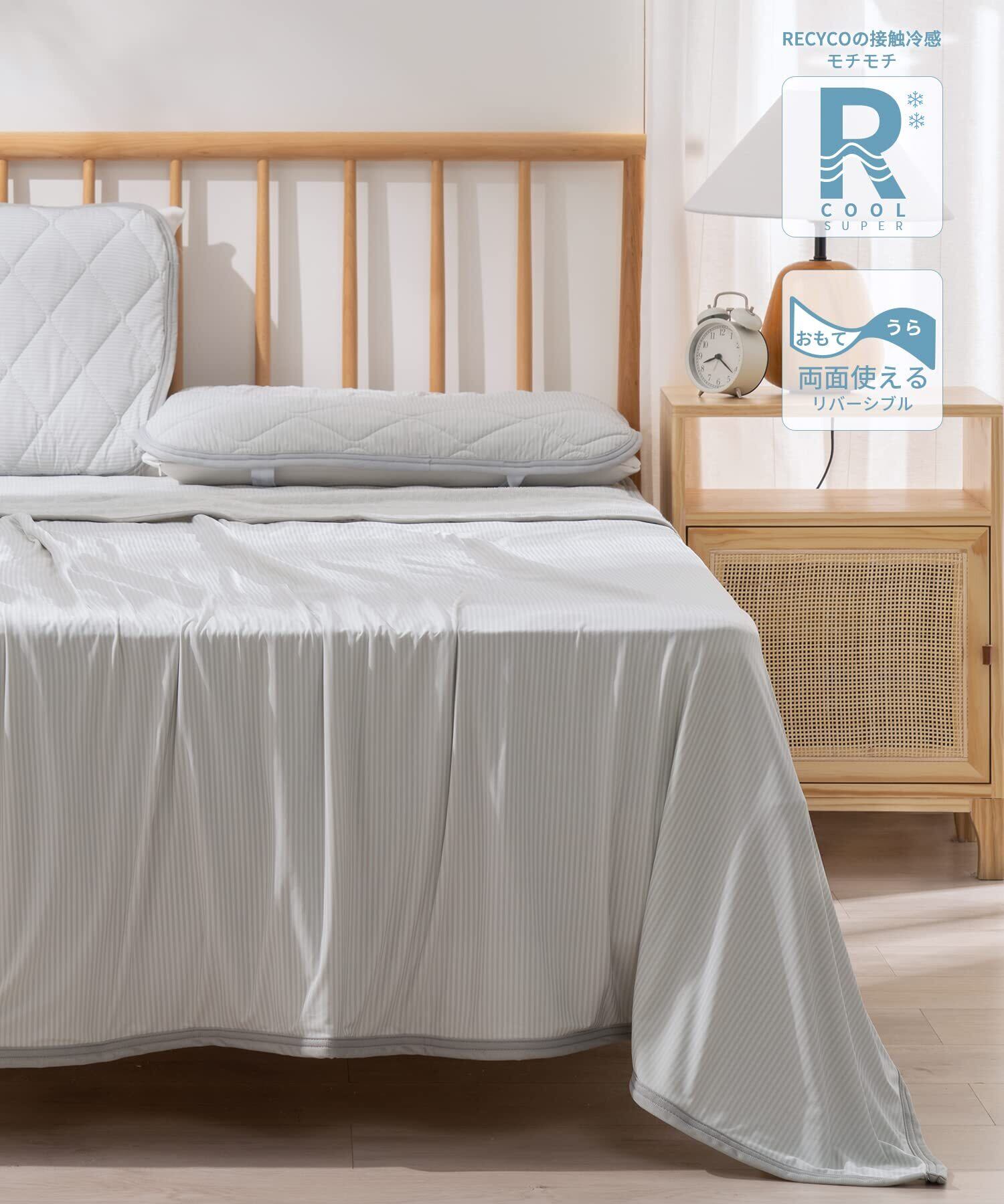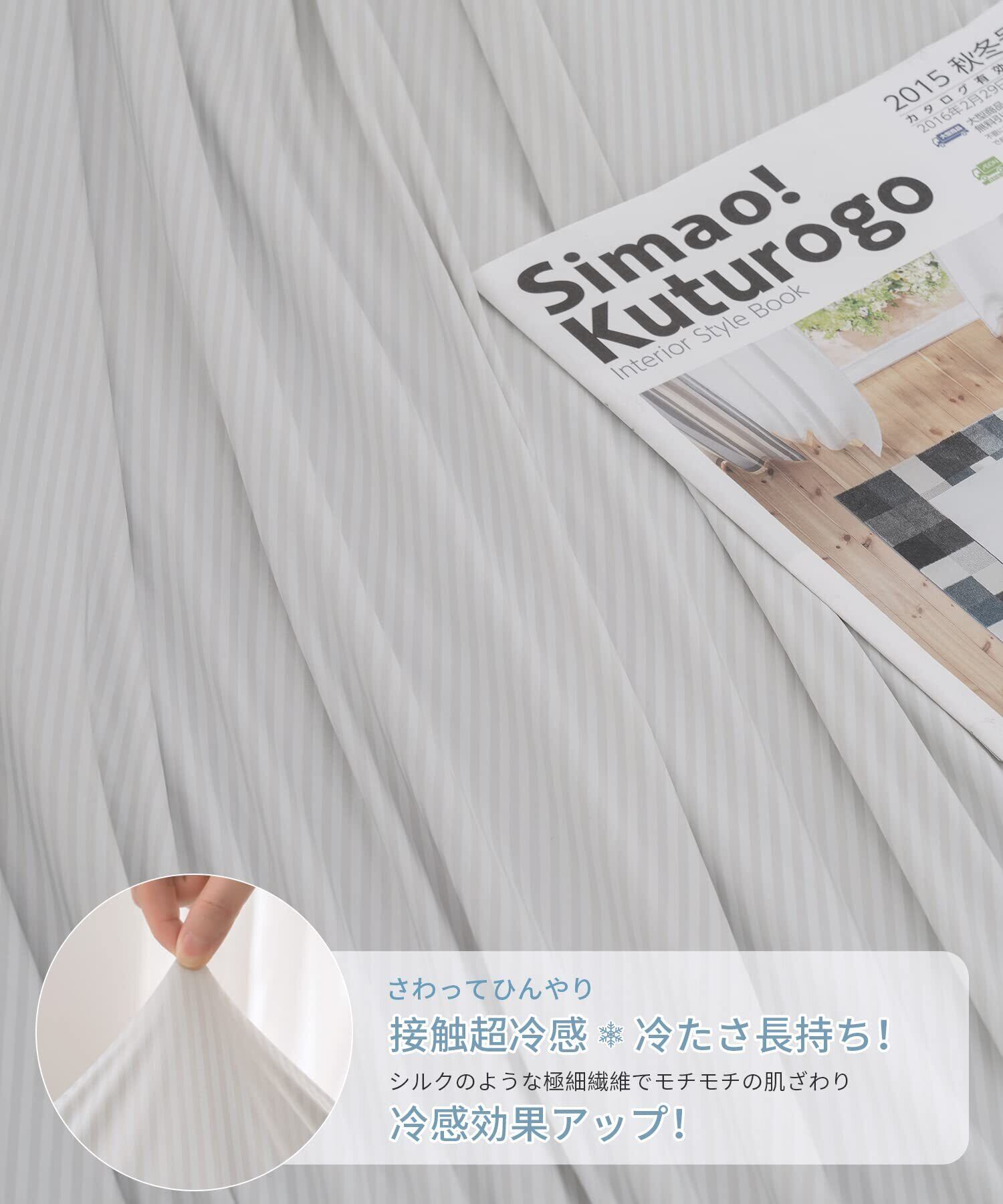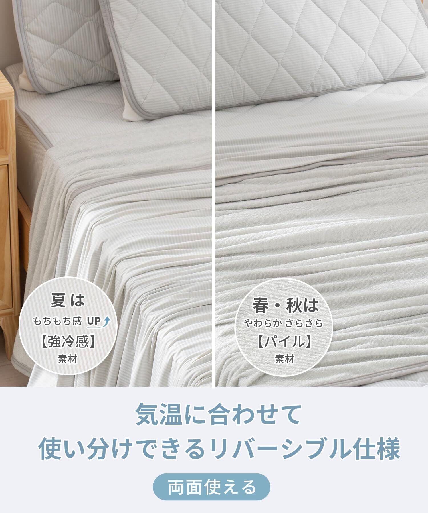 【仕様】2つのサイズ:シングル(140×190cm、ダブル(180×200cm)素材:接触超冷感生地、伸縮性あり、肌になじむシルクのようなモチモチの肌ざわり(表)+ふんわりとしたタオル地(裏)、夏に適合する寒色調なので、暑い夏に最適します。涼しく感じられます。