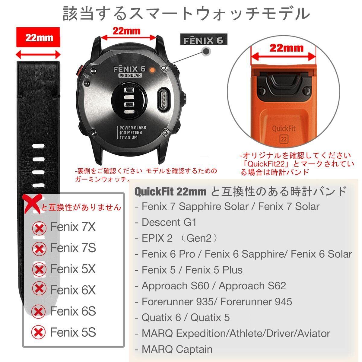 【該当するモデル】 スマートウォッチの背面にマークされているモデルを確認してください。QuickFit22mmストラップは、Fenix 7 Sapphire Solar/ Fenix 7 Solar, EPIX 2, Instict 2 Solar, Fenix 5/Fenix 5 Plus, Fenix 6/Fenix 6 Pro/Fenix 6 Sapphire,Quatix 6/Quatix 5,Approach S60/Approach S62 ,Forerunner 935/Forerunner 945,MARQ Expedition/Athlete/Driver/Aviator/Captain/Golfer。 このストラップは、オリジナルのストラップに「QuickFit22mm」のマークが付いている他の時計にも適しています。