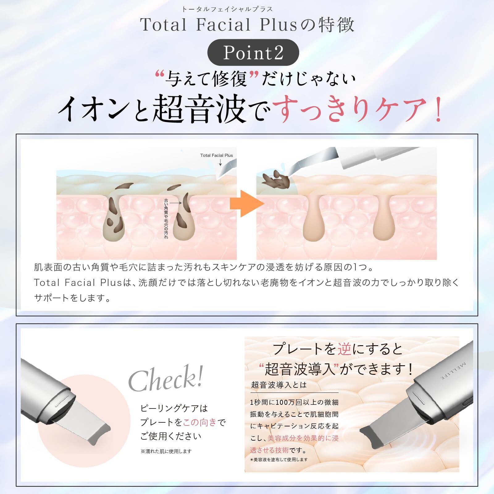【イオンクレンジング】イオン機能の洗顔で取れない頑固な汚れを取り除くことが期待できます。推奨頻度:週に2~3回、1日1回まで ※ピーリングケアと日を分けてご使用いただくことをおすすめします。【モイスチャー】肌に美容液を塗り、超音波振動で優しくタッピングすることで、うるおいの浸透*を高めます。※角質層まで。推奨頻度:1日1回