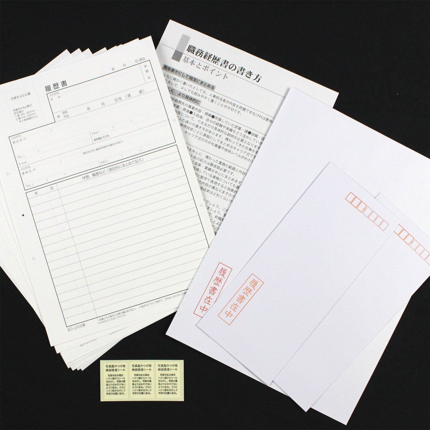 用紙4枚、職務経歴書2枚、自己紹介書2枚、封筒(大)1枚、封筒(小)2枚、写真貼付シール3枚入(1セットあたり)。