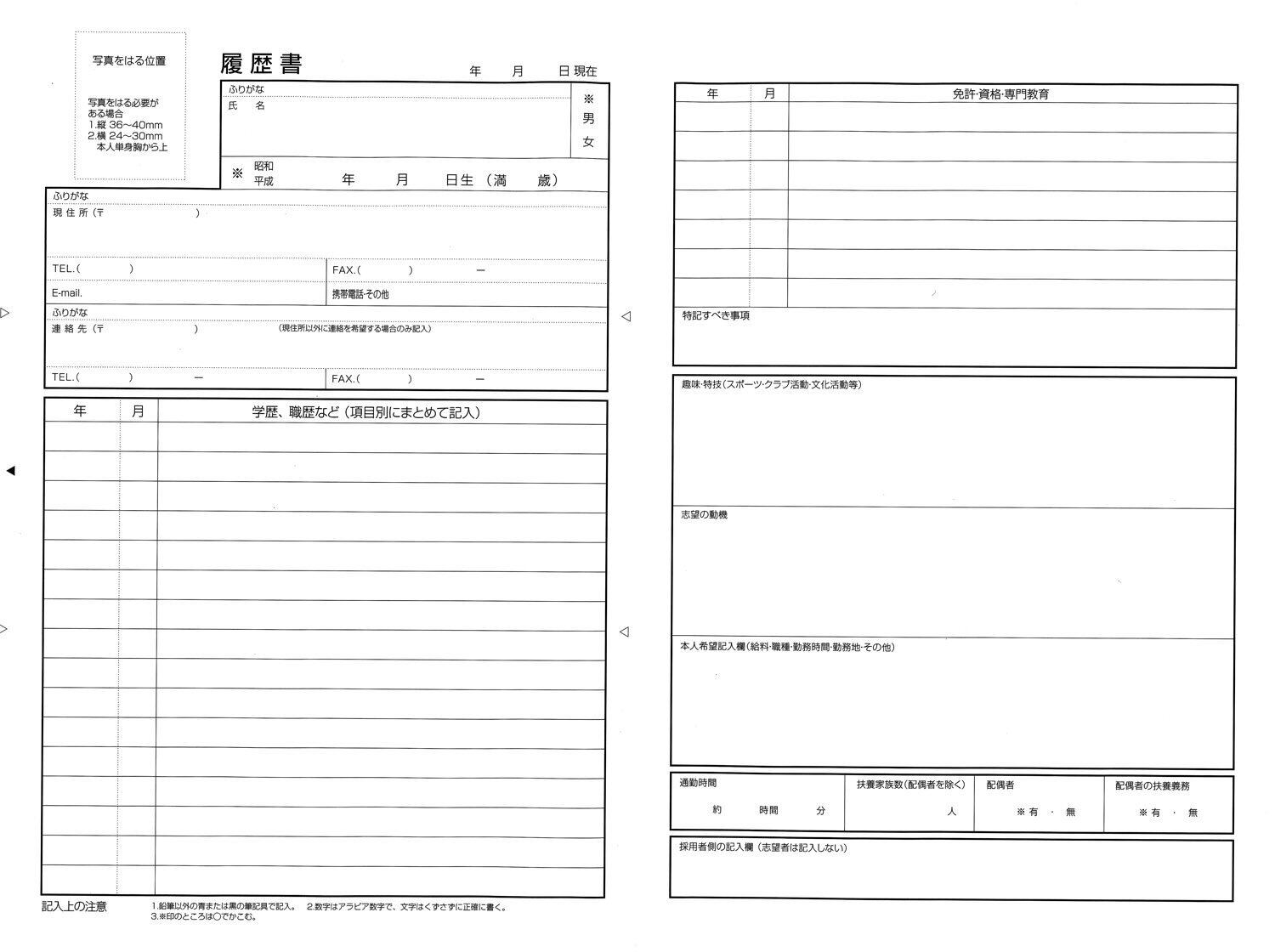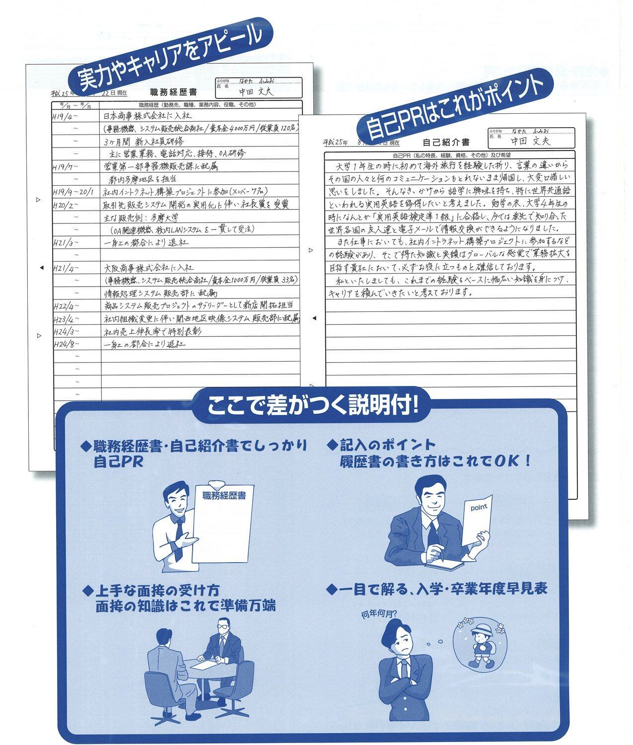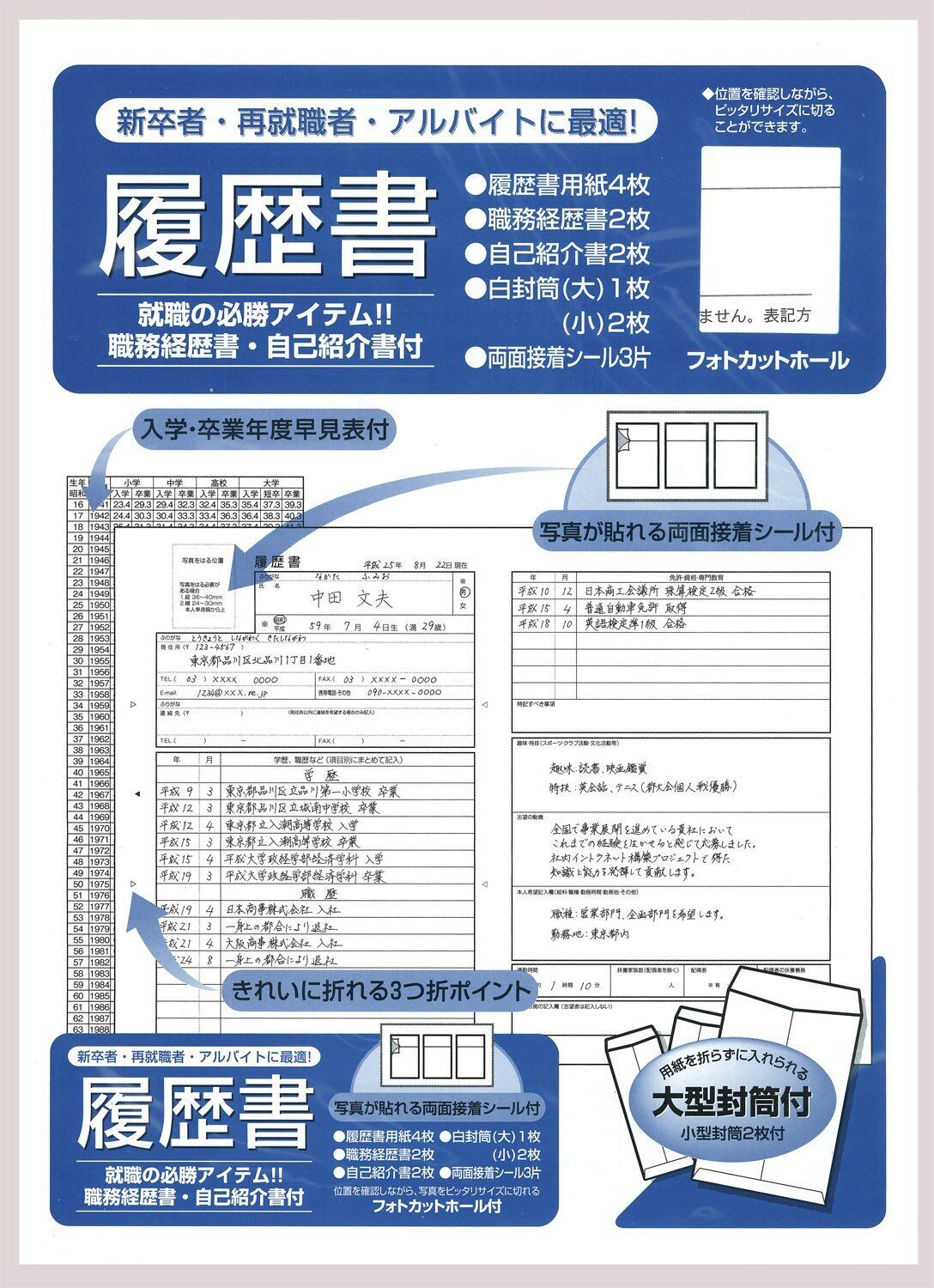 新卒者、再就職者、アルバイトに最適な職務経歴書と自己紹介書が履歴書とセットになった履歴書用紙B5です。きれいに3つ折りできるポイント付、入学・卒業年度早見表付です。