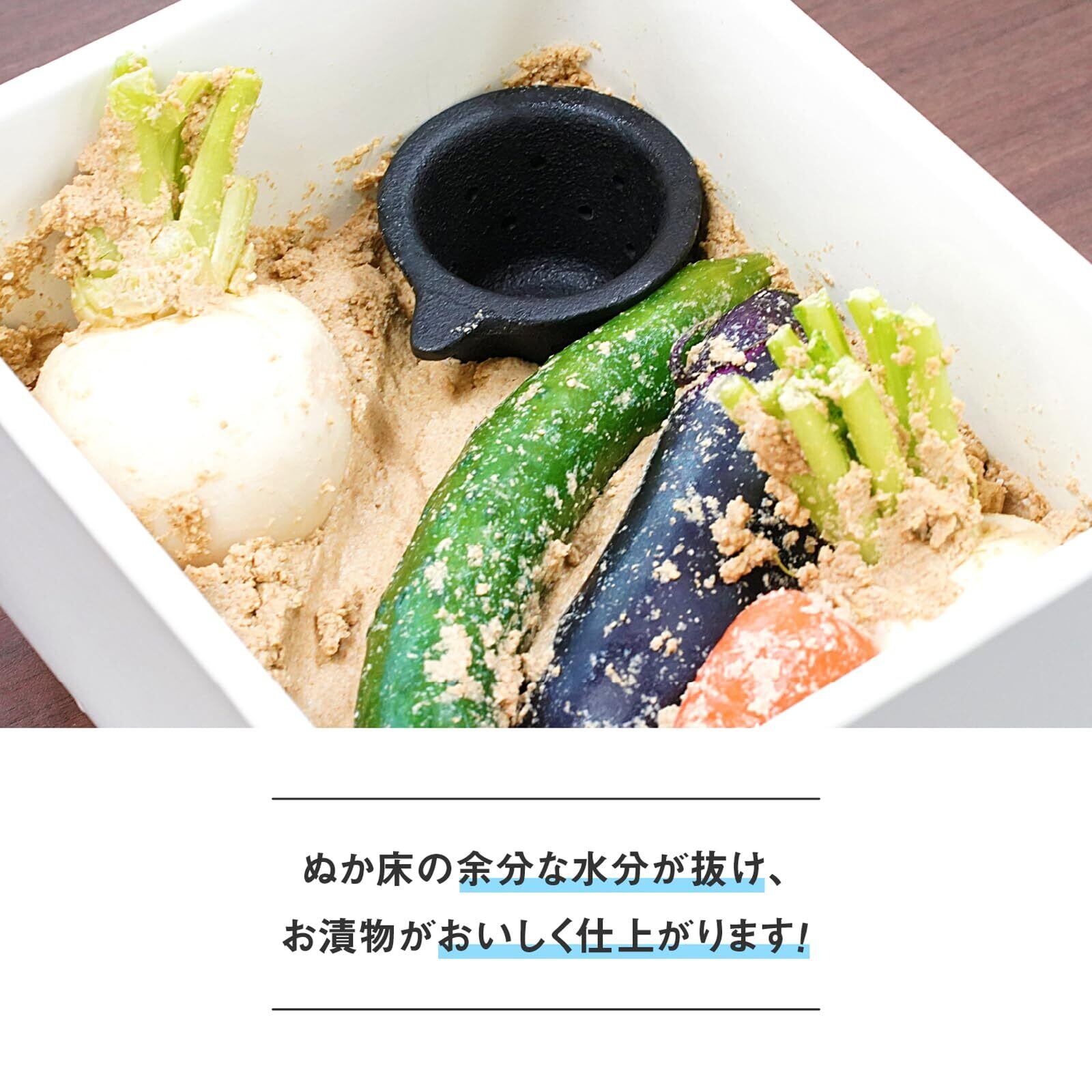 鉄鋳物で出来ているので、茄子などの色づけの効果もございます。ヌカ床の余分な水分をとってくれる。鉄鋳物なので色づけ効果も兼ねている。