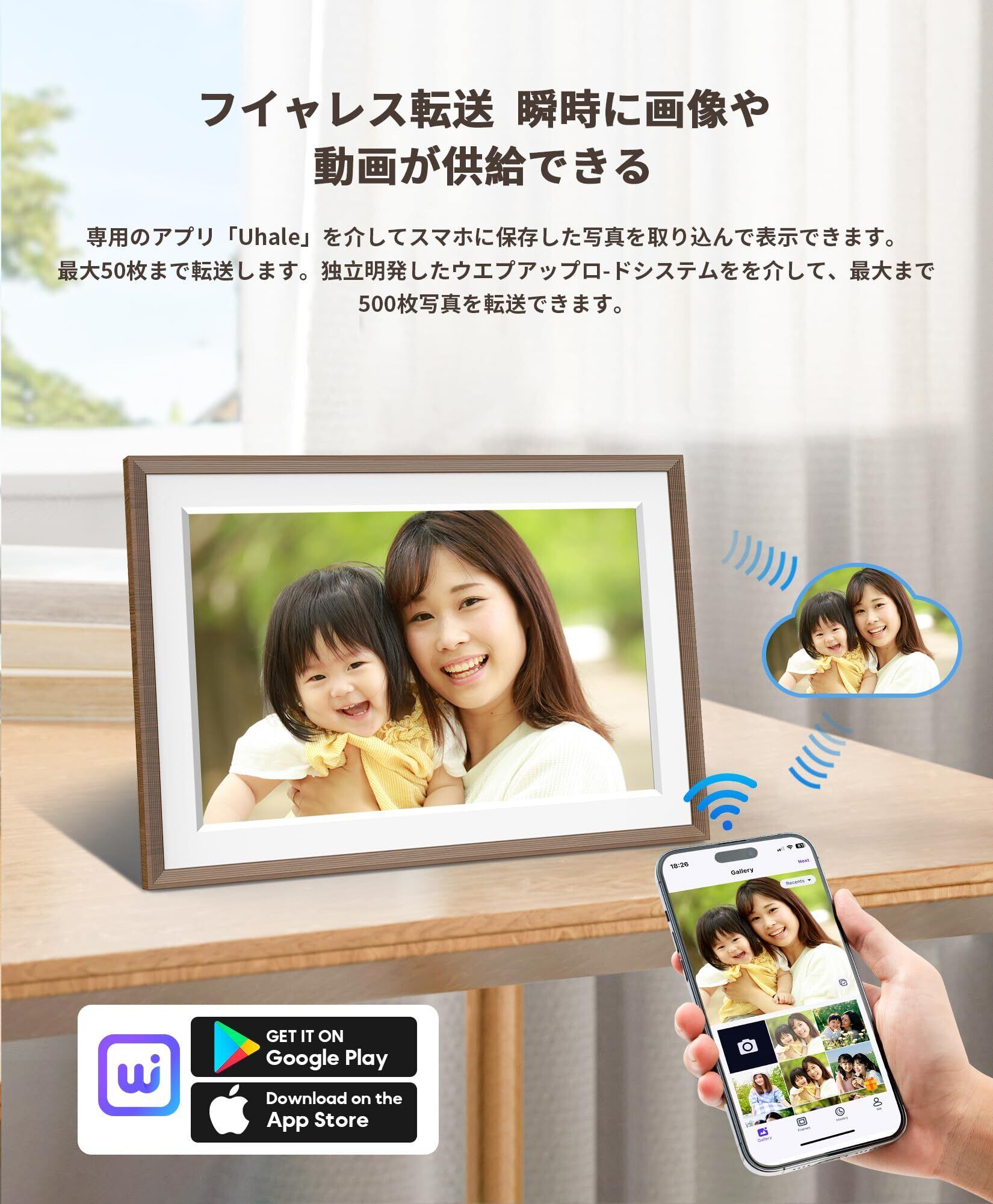 【スマホWi-Fi高速転送・パソコンバッチ転送】専門無料のアプリ「Uhale」を提供し、Android或いはiOSもダウンロードできます。スマホで一度に最大100枚の写真を選ぶことができて、分次送信の悩みがありません。パソコンで最大500枚まで送信できます。フォーマットの問題を心配する必要はありません。どのフォーマットでもフォトフレームから表示可能なフォーマットに変換できます。フォーマット:jpeg/jpg/png。