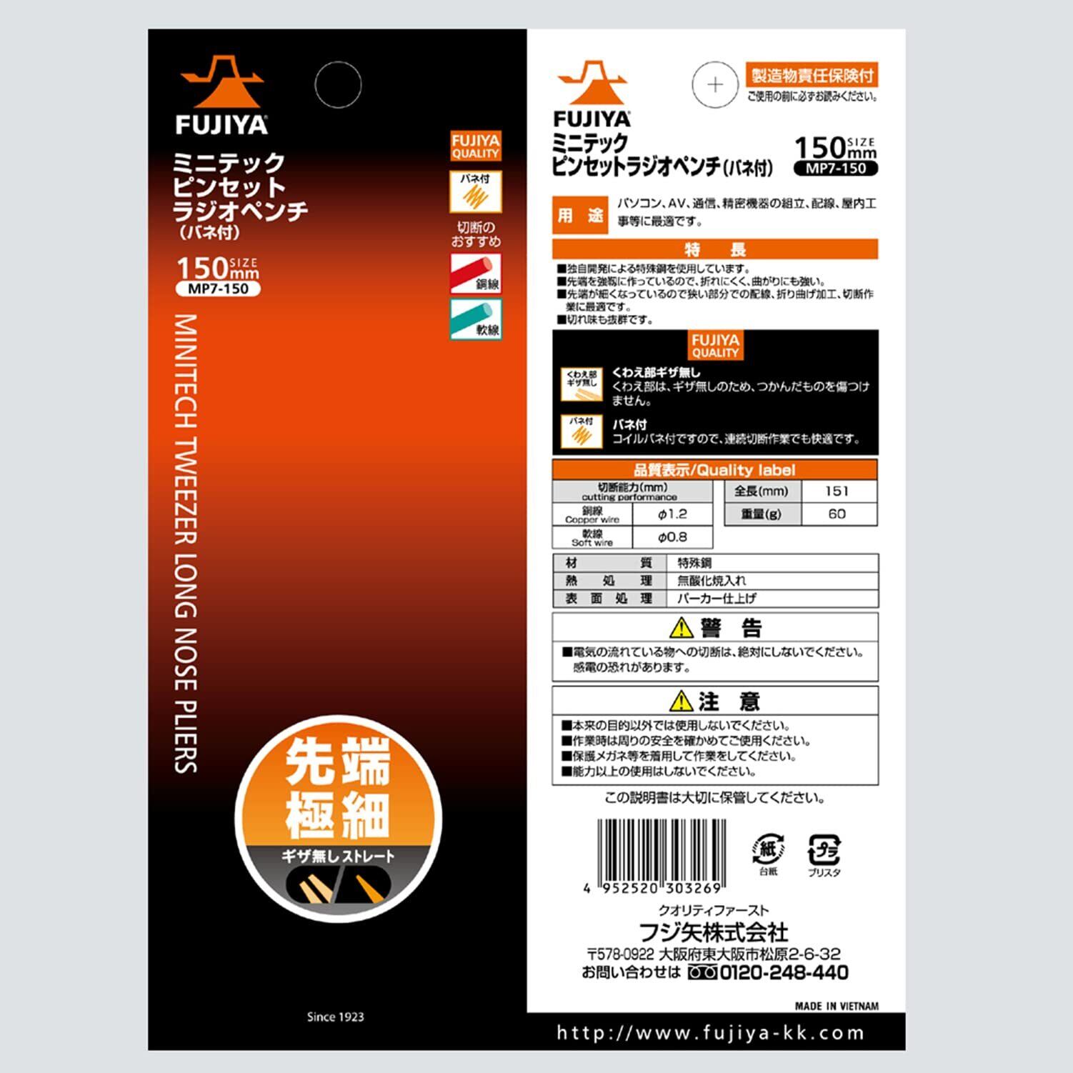 フジ矢(Fujiya) ピンセットラジオペンチ 極細仕様で精密作業に最適 (バネ付・ギザ無) 150mm MP7-150