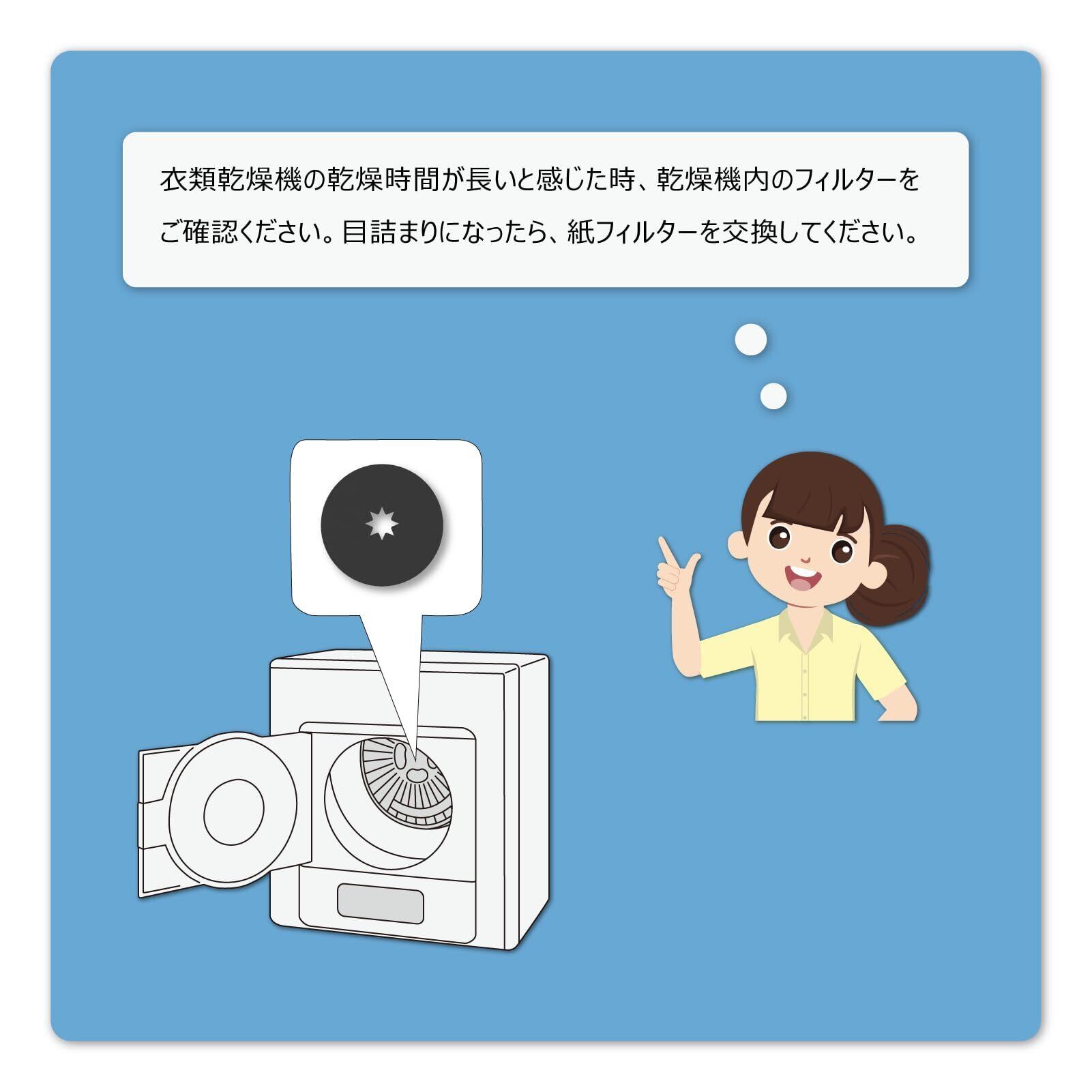 【乾燥に肝心】衣類乾燥機の乾燥時間が長いなぁ~と感じをする時がありますか?その感じがあった時、乾燥機の中の紙フィルターの交換をお勧めします。使い捨てタイプですので、毎回ご利用後ご交換ください。