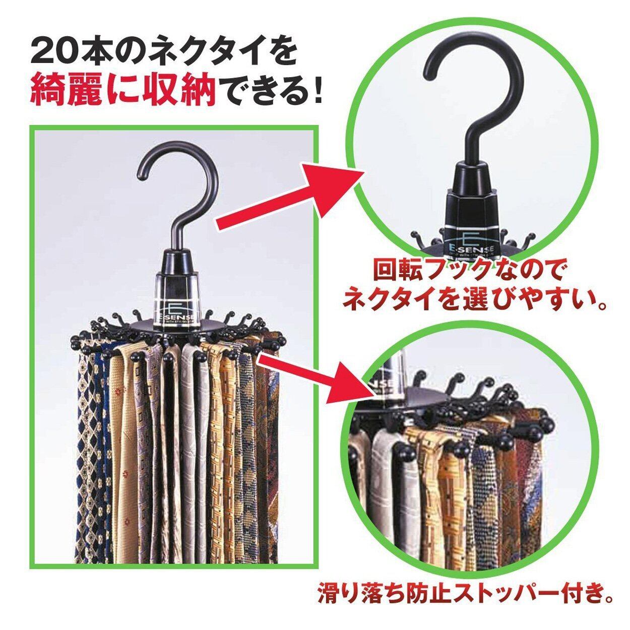 ハンガーはフック部分が360度回転します。回転させながらネクタイを選べるので、お好みのネクタイがどこの位置に掛けられていても簡単に手に取ることができます。