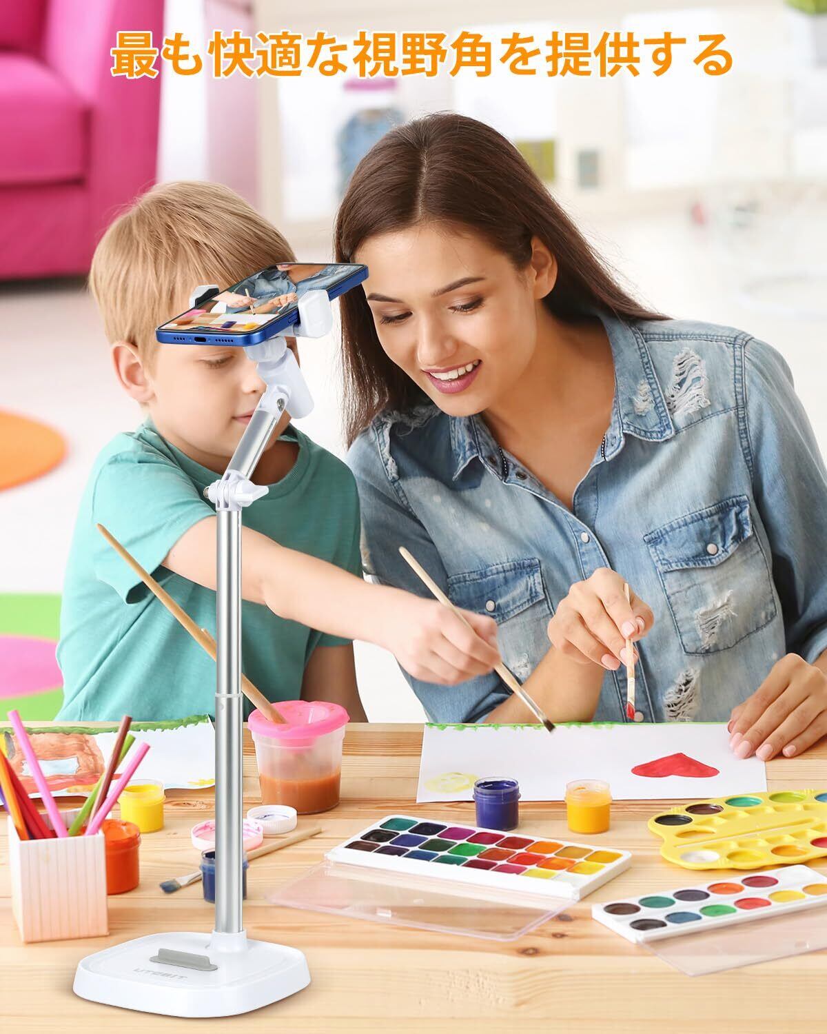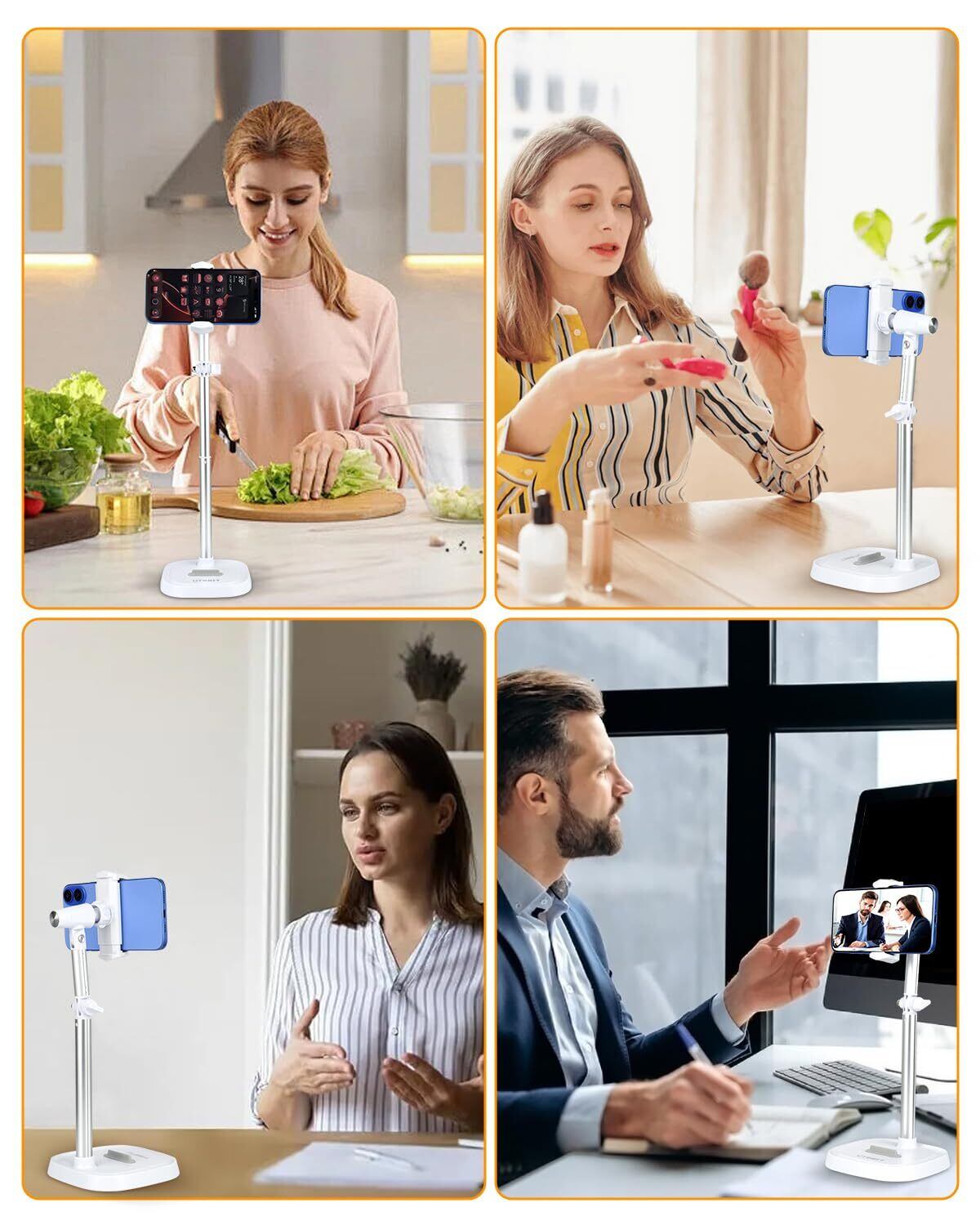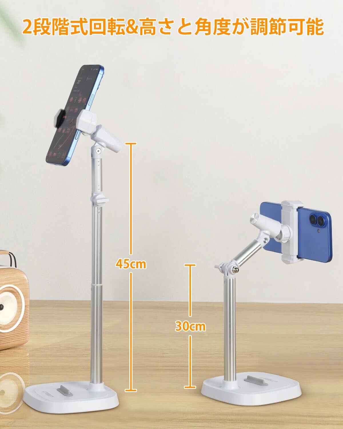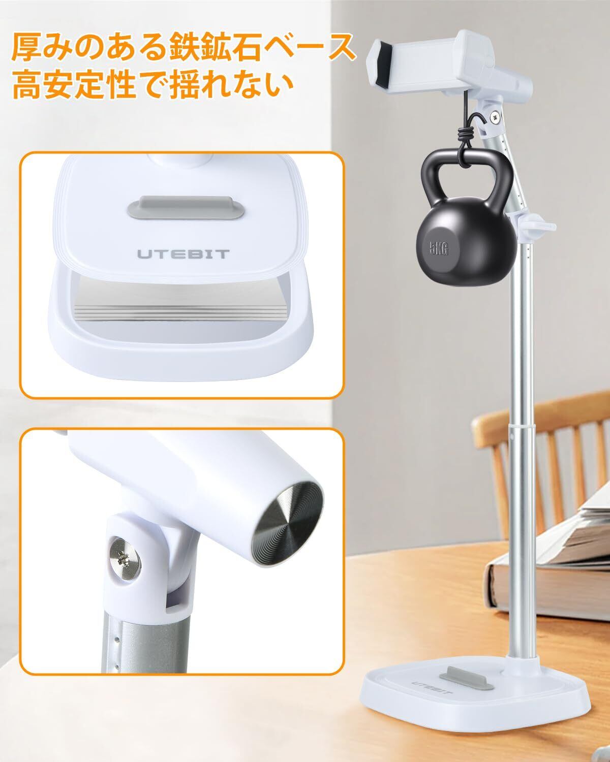 UTEBIT スマホスタンド 卓上 高さ調整 30-45cm 自由回転可能 横/縦置き 携帯 タブレット両用 スマホ撮影 安定感 電話ホルダー 昇降式 スマホ置き 滑り止め 角度調整 俯瞰撮影 カメラスタンド 片手操作 撮影/動画配信/映画鑑賞 iphone/Android用 白