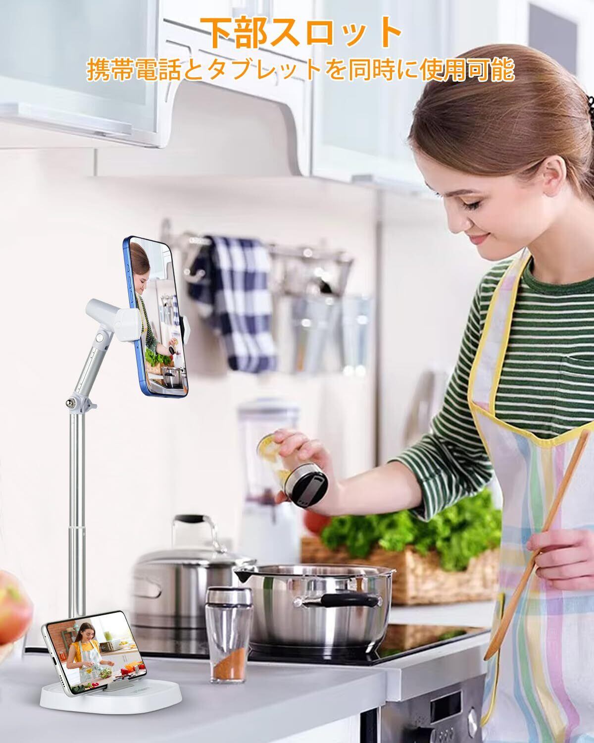 【360°角度調整と180°縦回転】新版のスマホ撮影スタンドは2段階式回転を採用しますので、360°角度調整をサポートし、さらに180度の縦回転を追加し、俯瞰撮影に対応し、市販の携帯たて スタンドよりも多くのアングルを解放しています。【携帯とタブレットを同時にサポート可能 】携帯撮影スタンドの台座にはストッパーが追加されるので、タブレットを支えるのにも最適です。